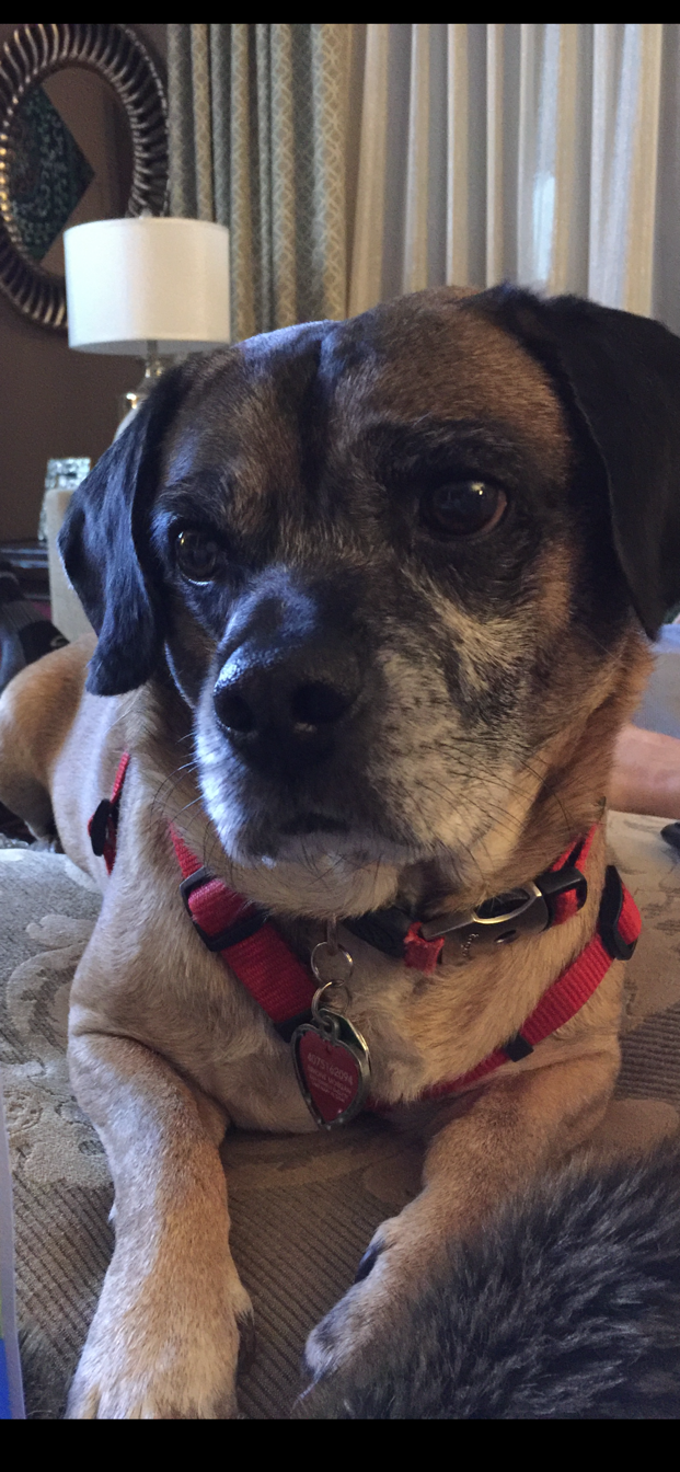 Painting of a dog named Brilley wearing a red collar and heart-shaped tag.