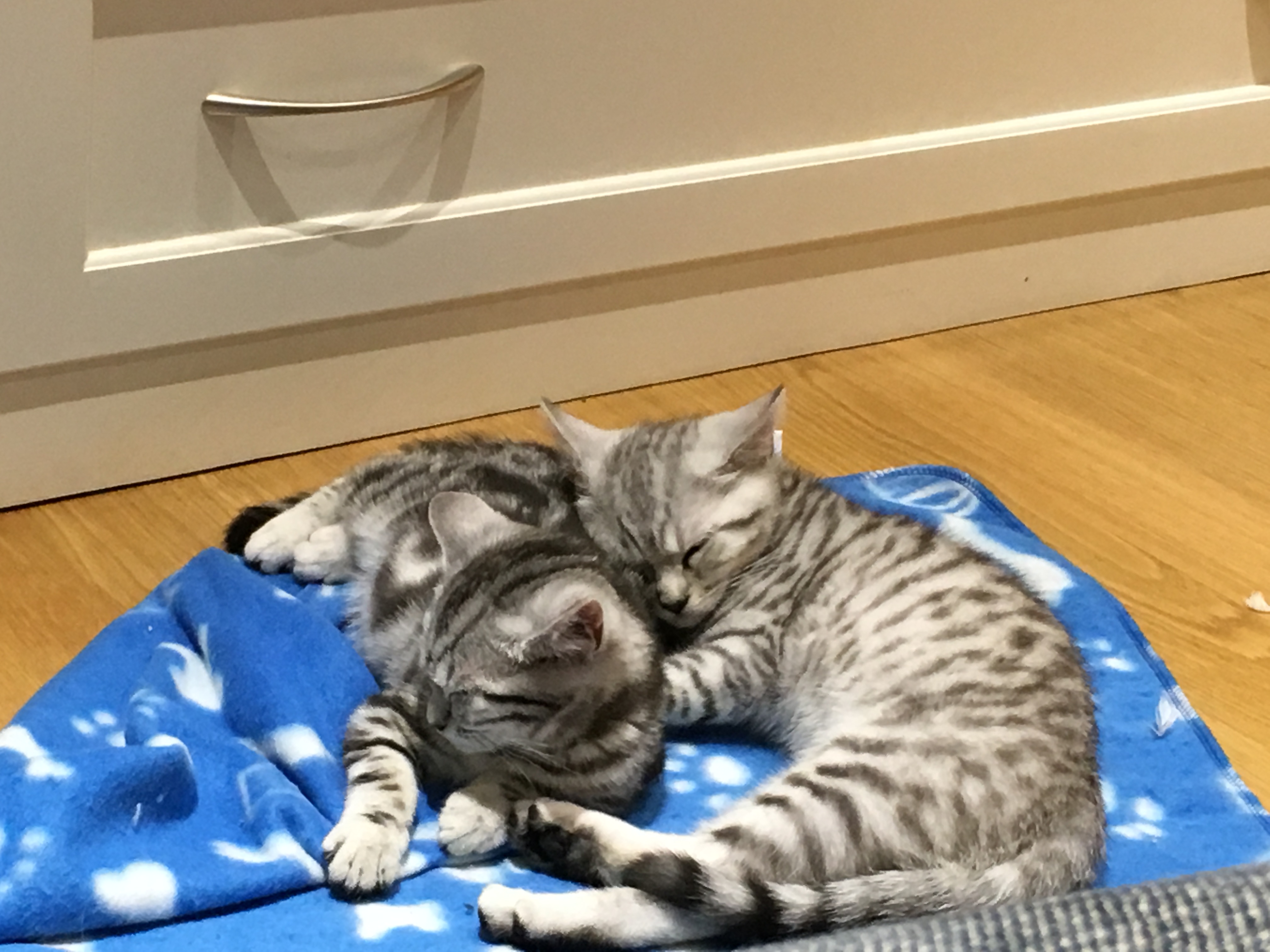 Two silver tabby kittens sleeping together on a blue blanket.