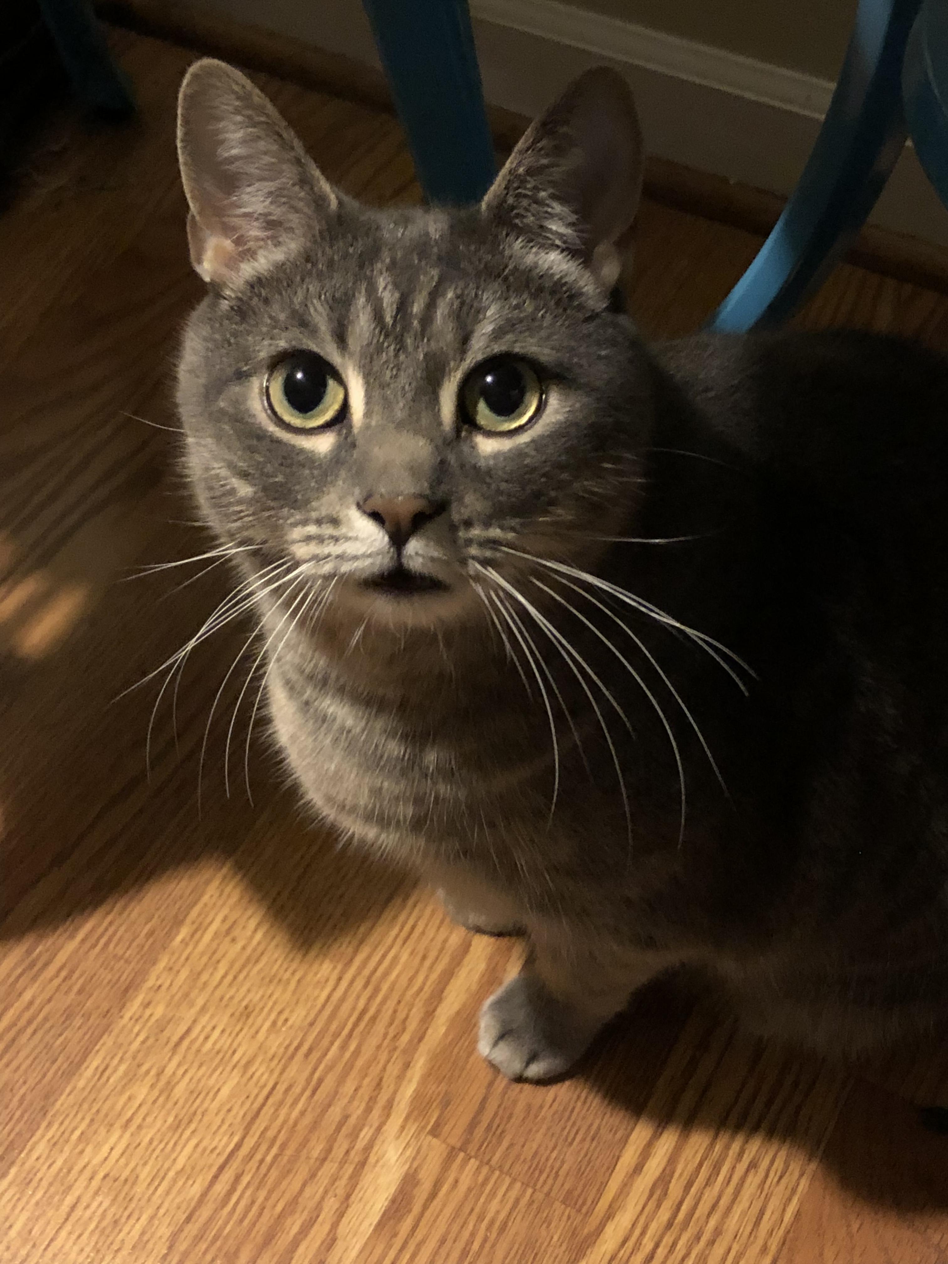 Oil painting of a gray tabby cat looking at the viewer