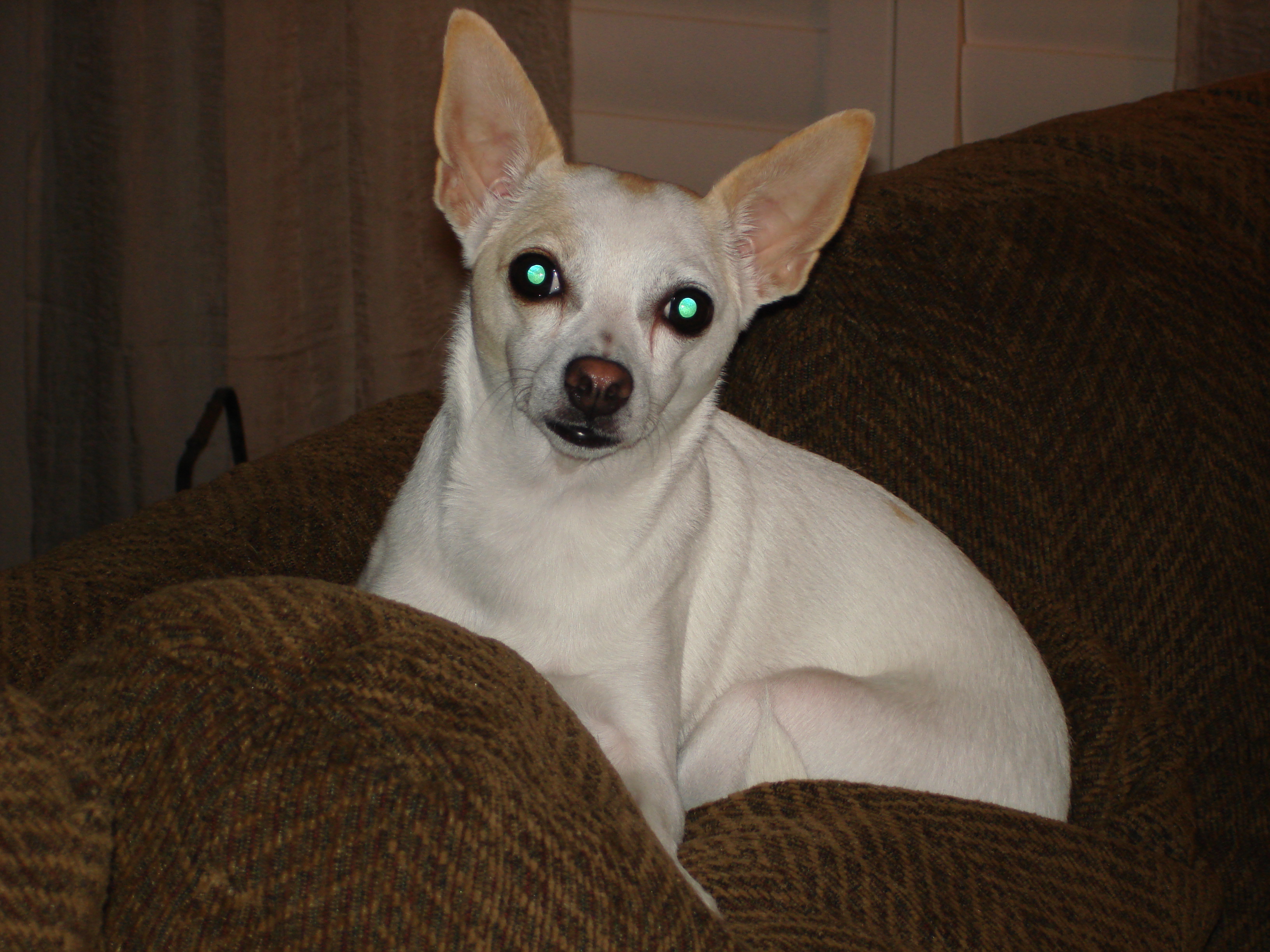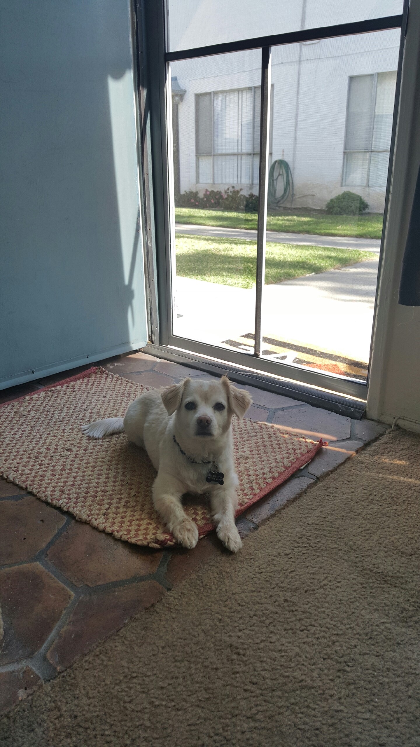 Painting of a light cream-colored puppy wearing a collar with a bone-shaped tag.
