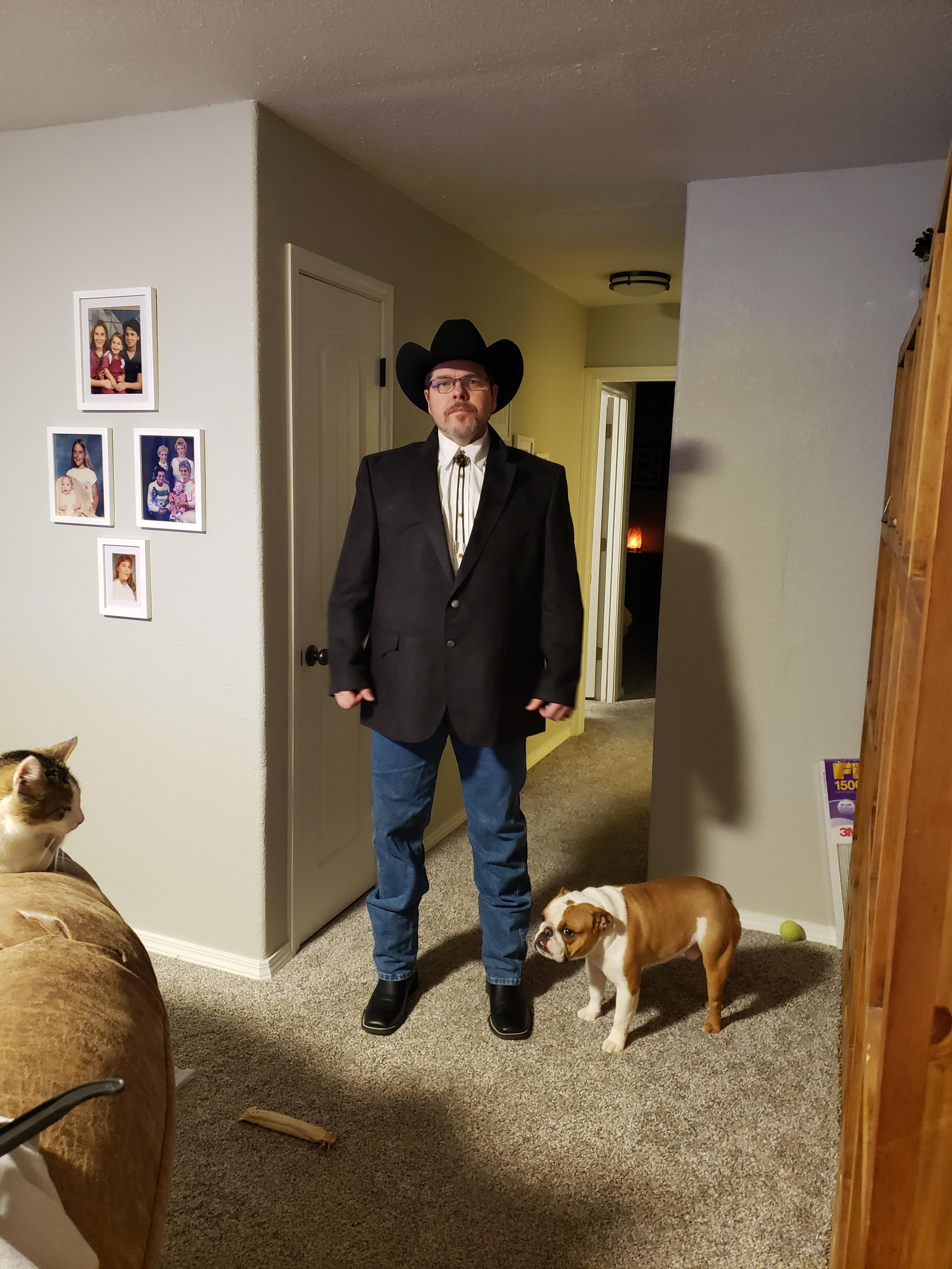 Oil painting portrait of a man in a cowboy hat with two girls.