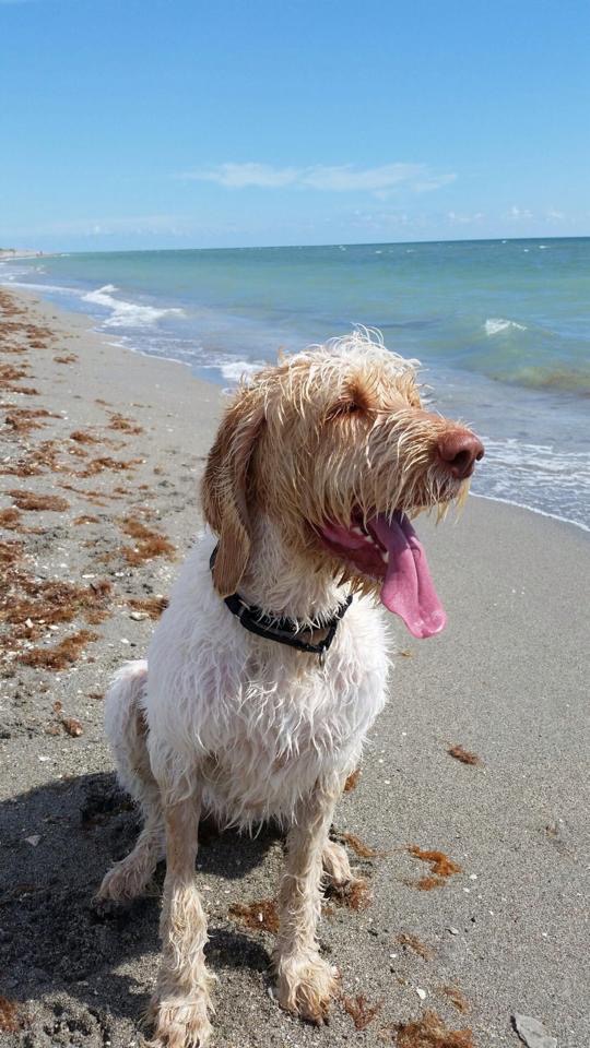 Painting of a fluffy white and tan dog panting on a beach