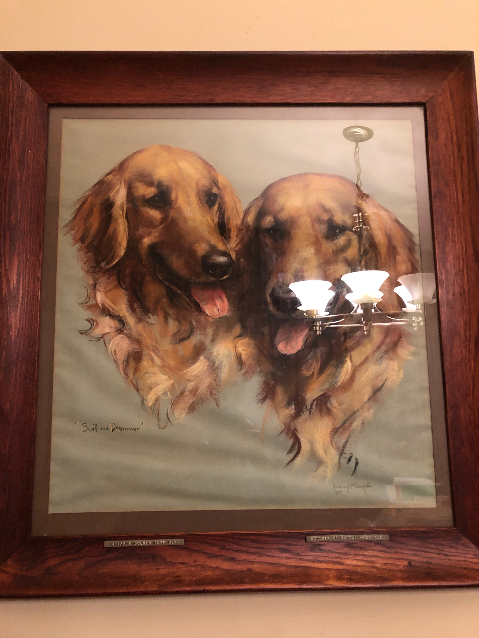Painting of a chocolate Labrador Retriever wearing a red collar.