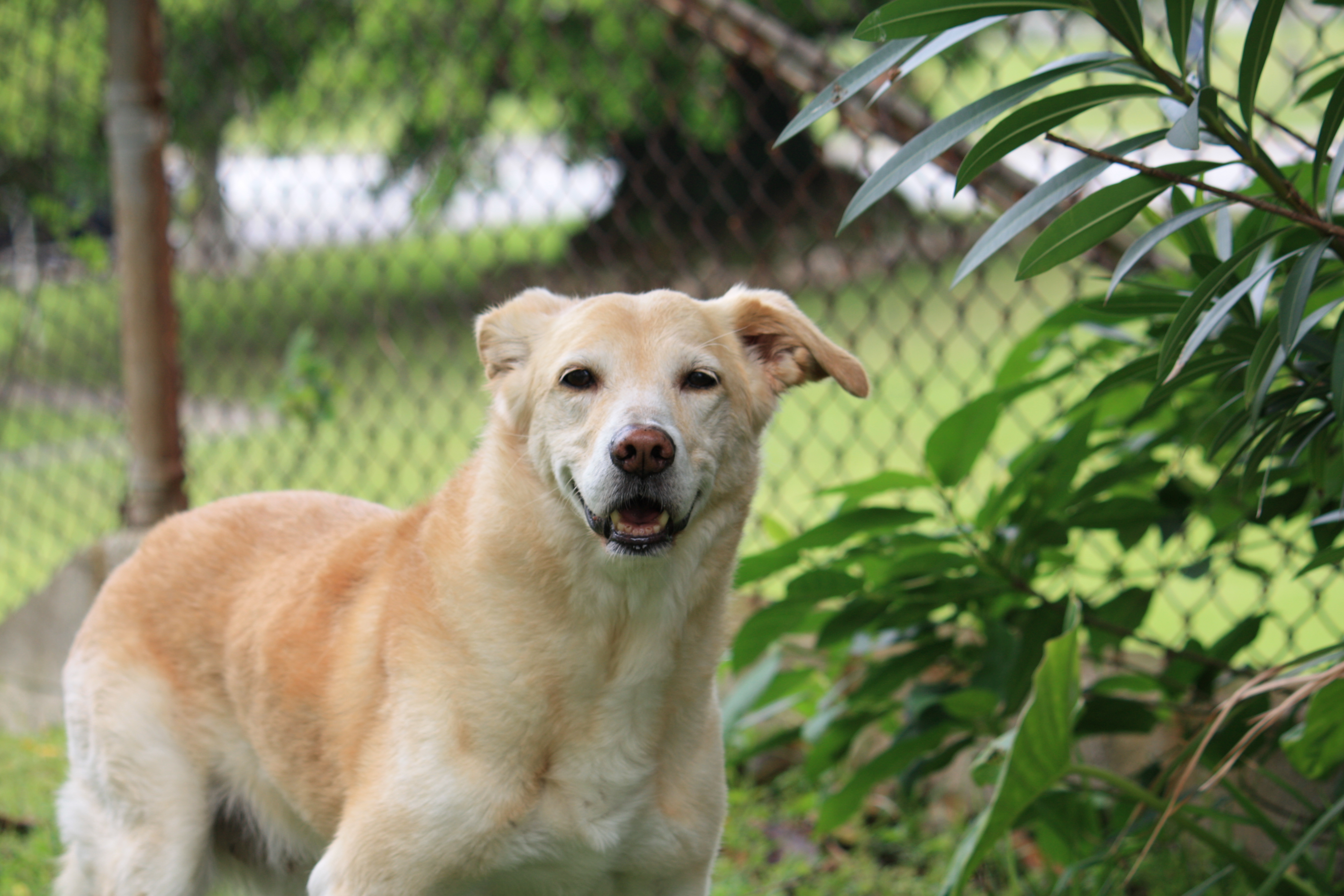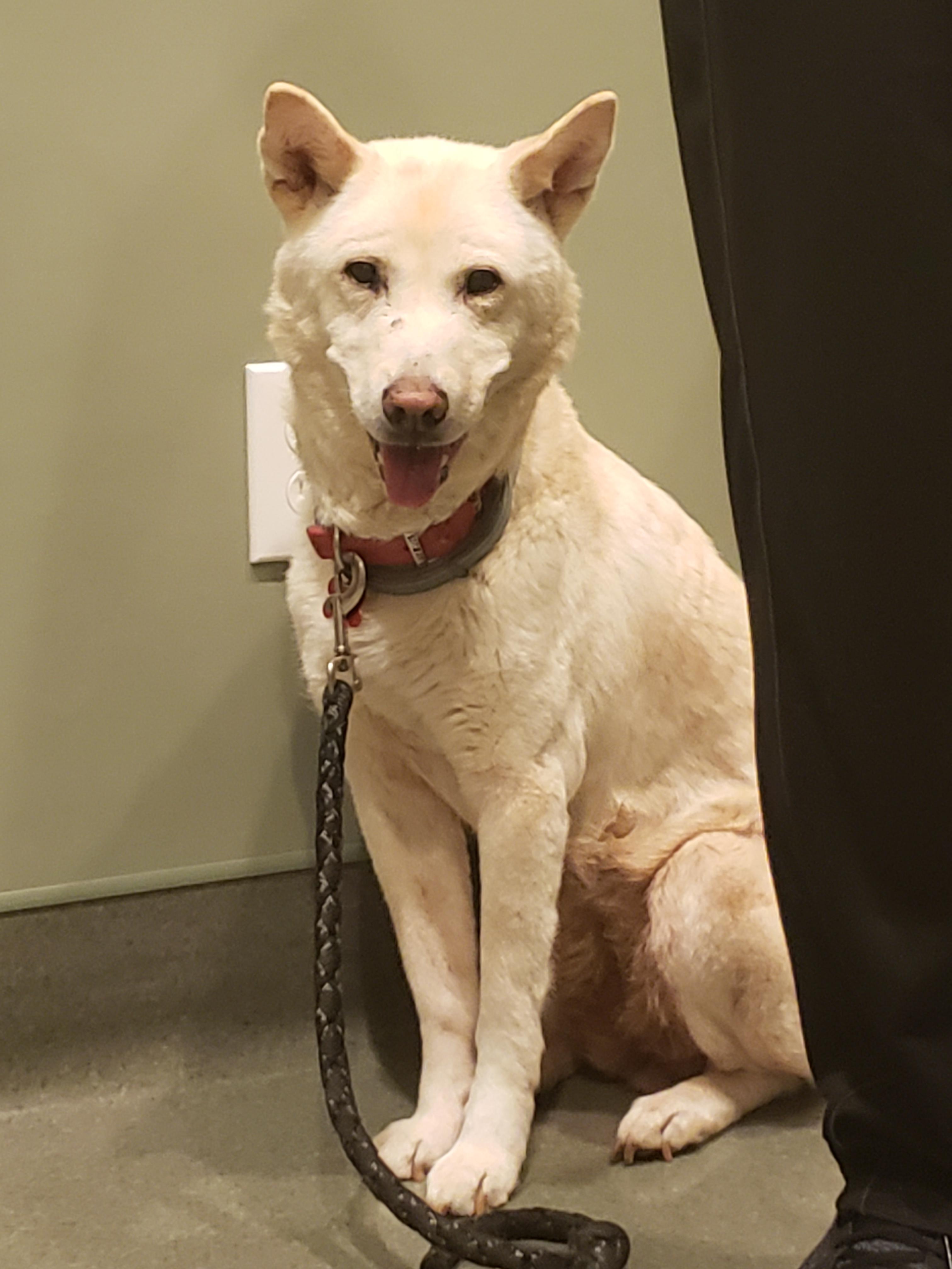 Painting of a cream-colored dog wearing a brown collar.