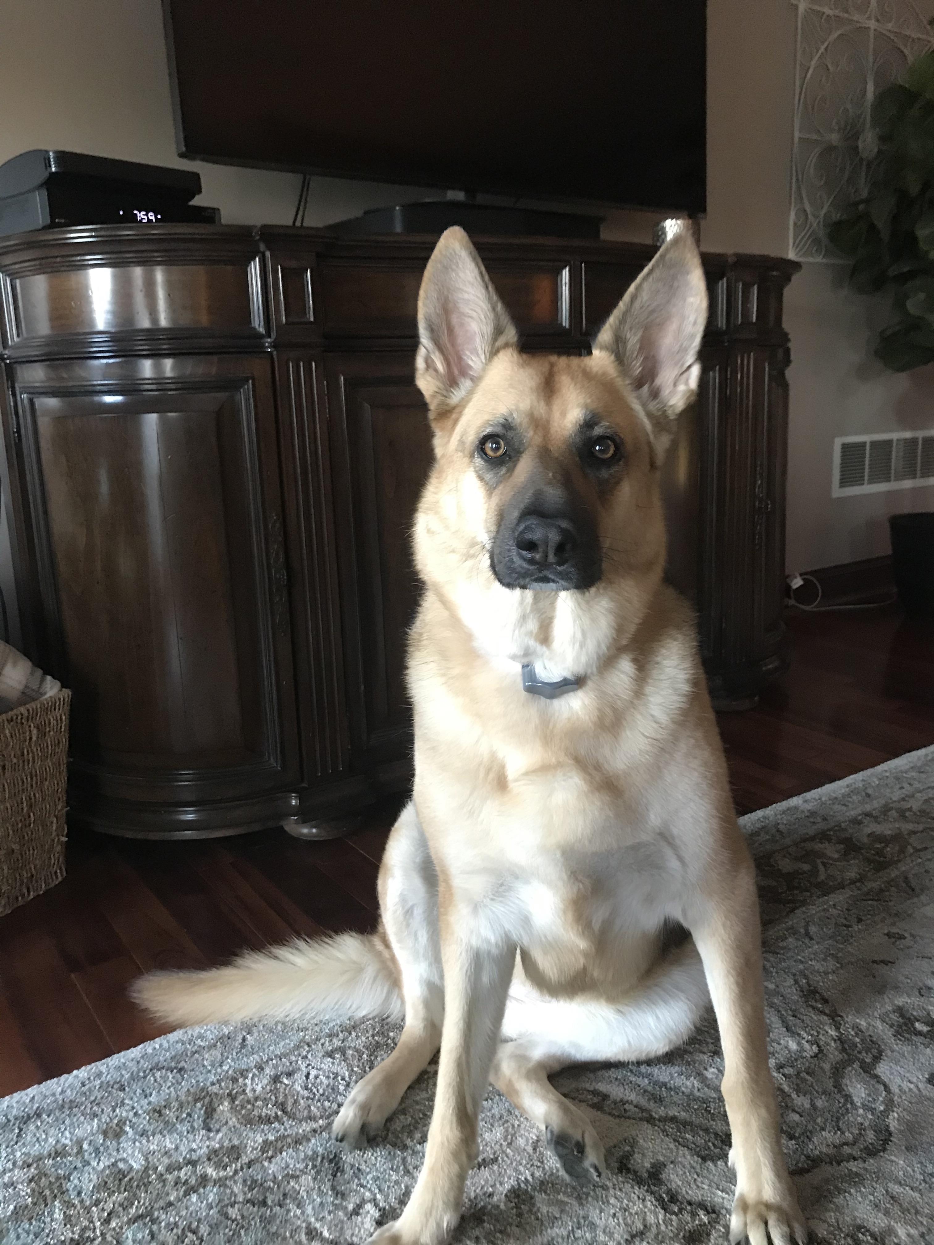 Painting of a German Shepherd dog wearing a blue collar