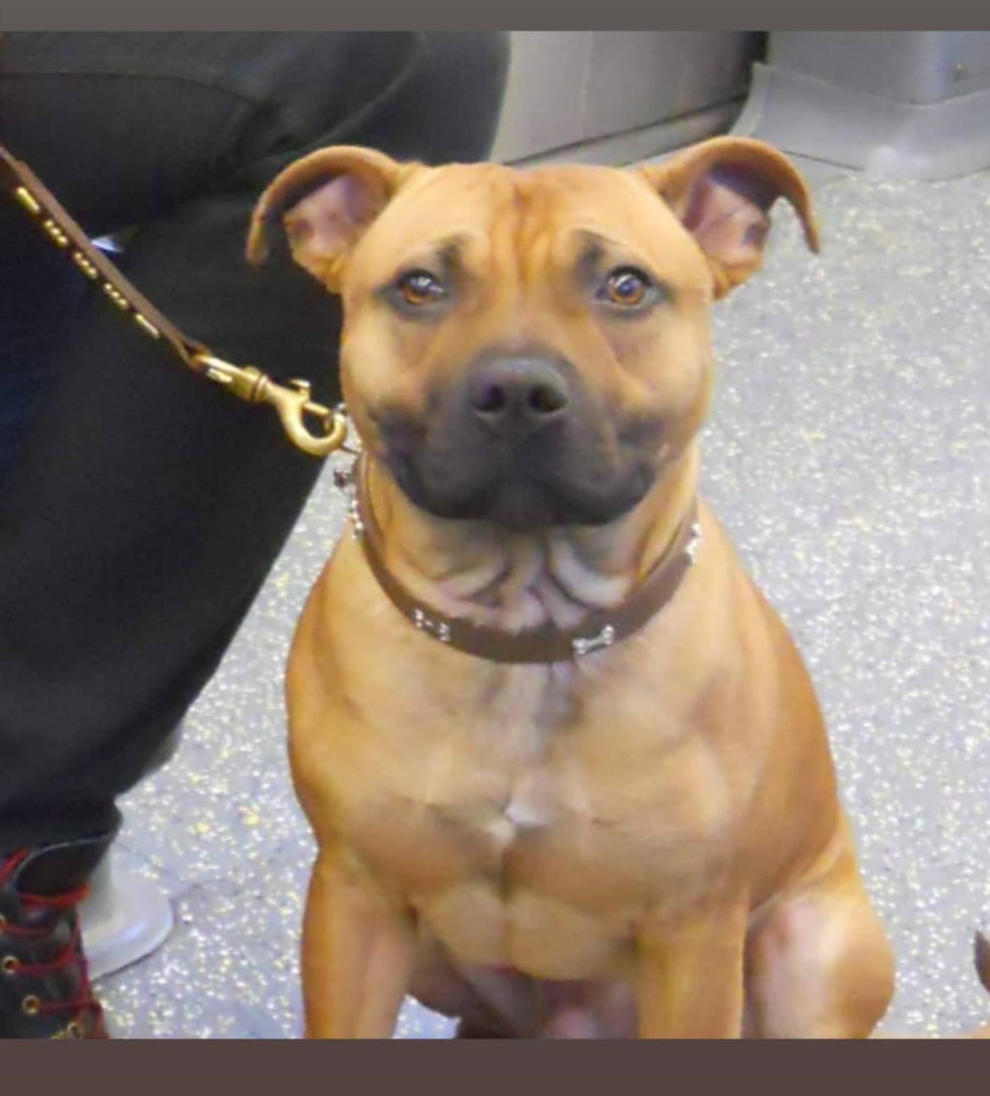 Painting of a fawn-colored Staffordshire Bull Terrier wearing a brown collar.
