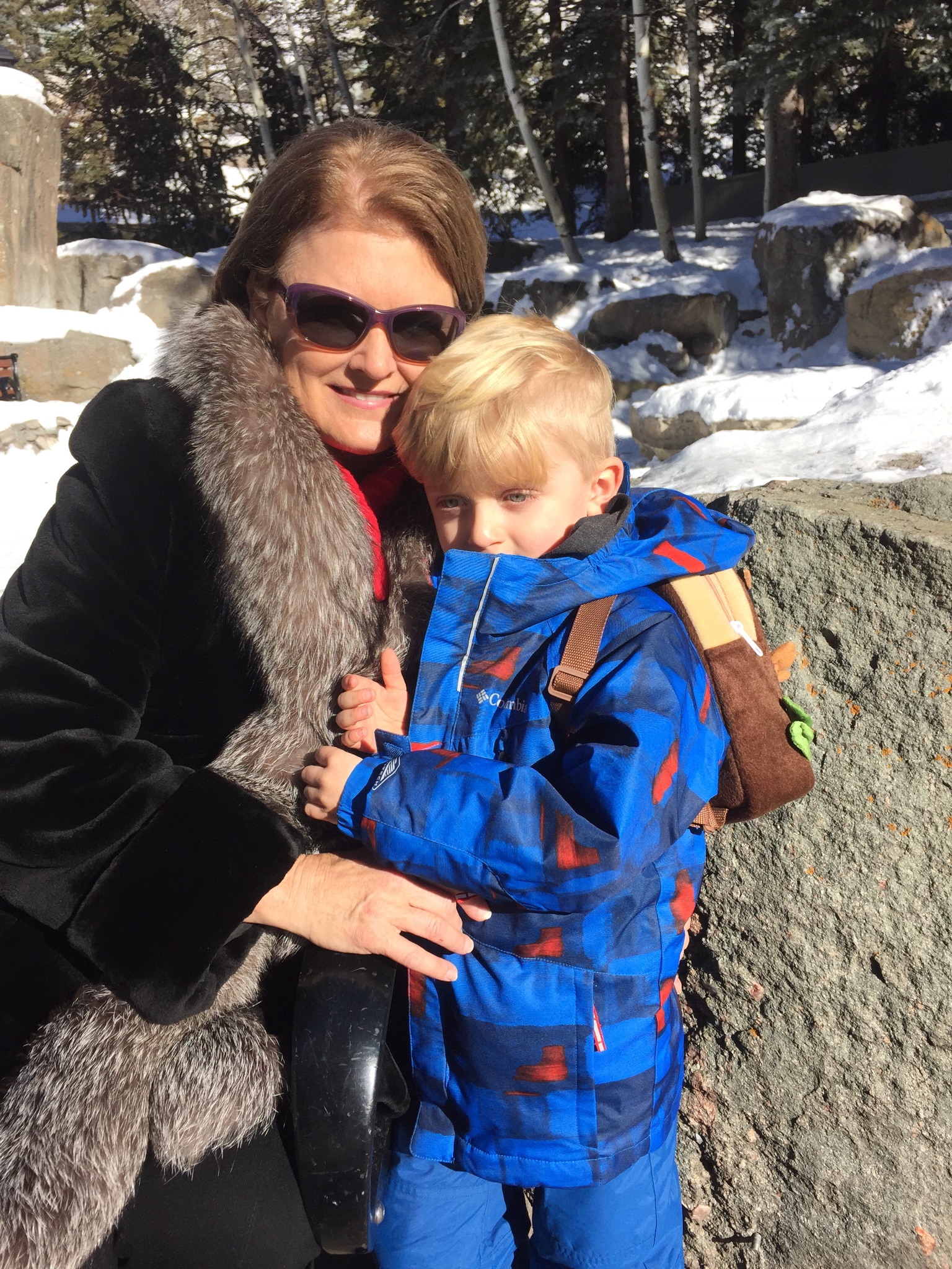 Painting of a woman in sunglasses hugging a young boy in a blue snowsuit outdoors in the winter.