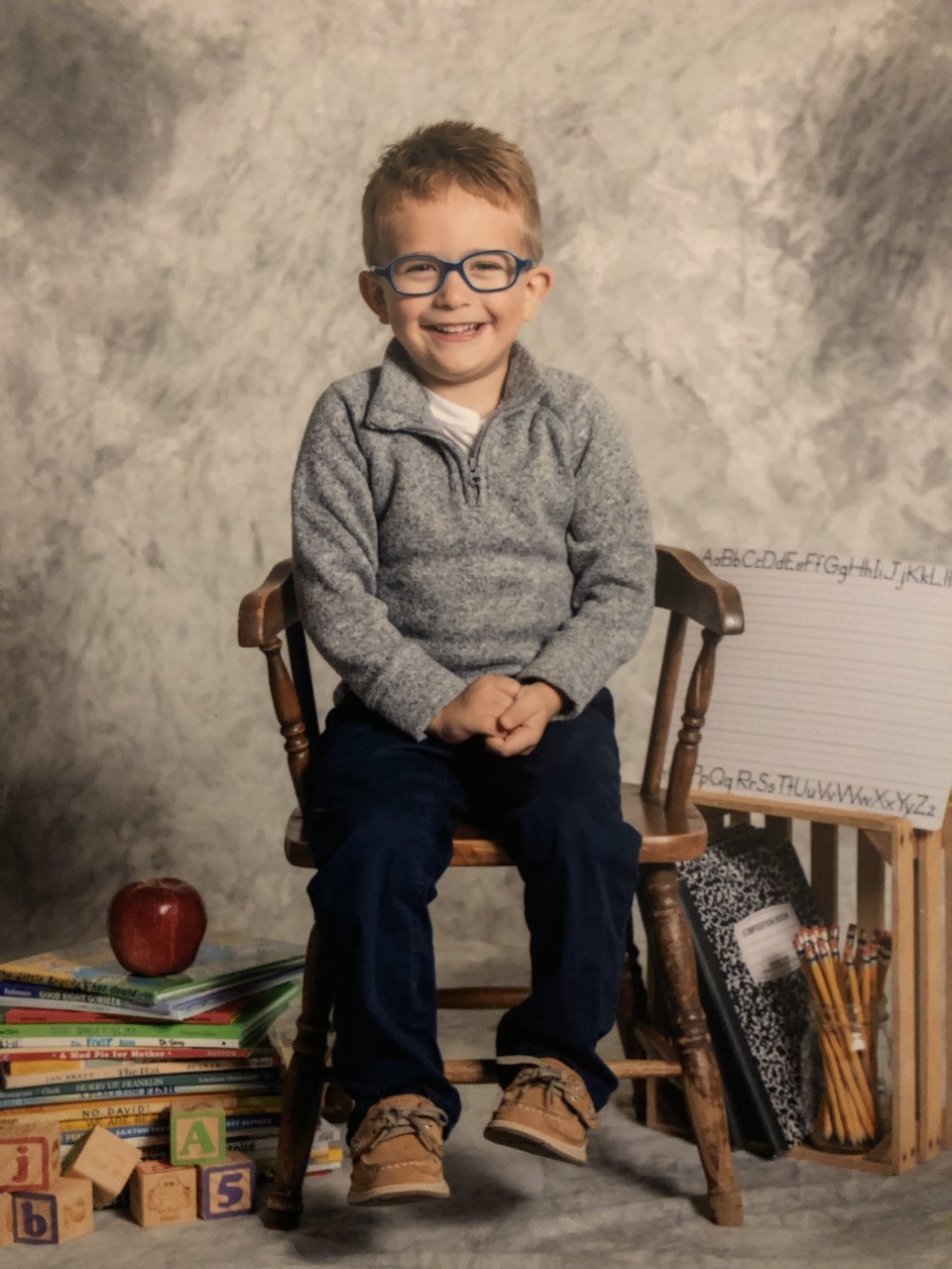 Portrait of a smiling boy in glasses sitting in a wooden chair with books and an apple.