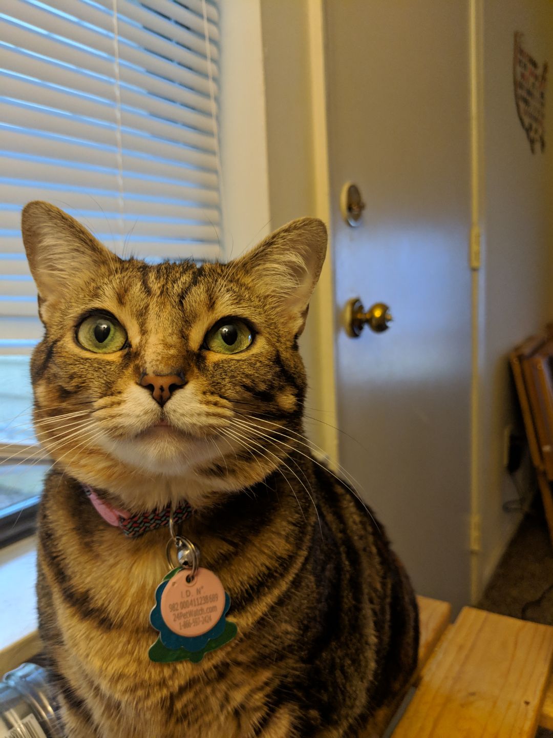 Painting of a tabby cat wearing a collar with a tag that reads Jillian Venus