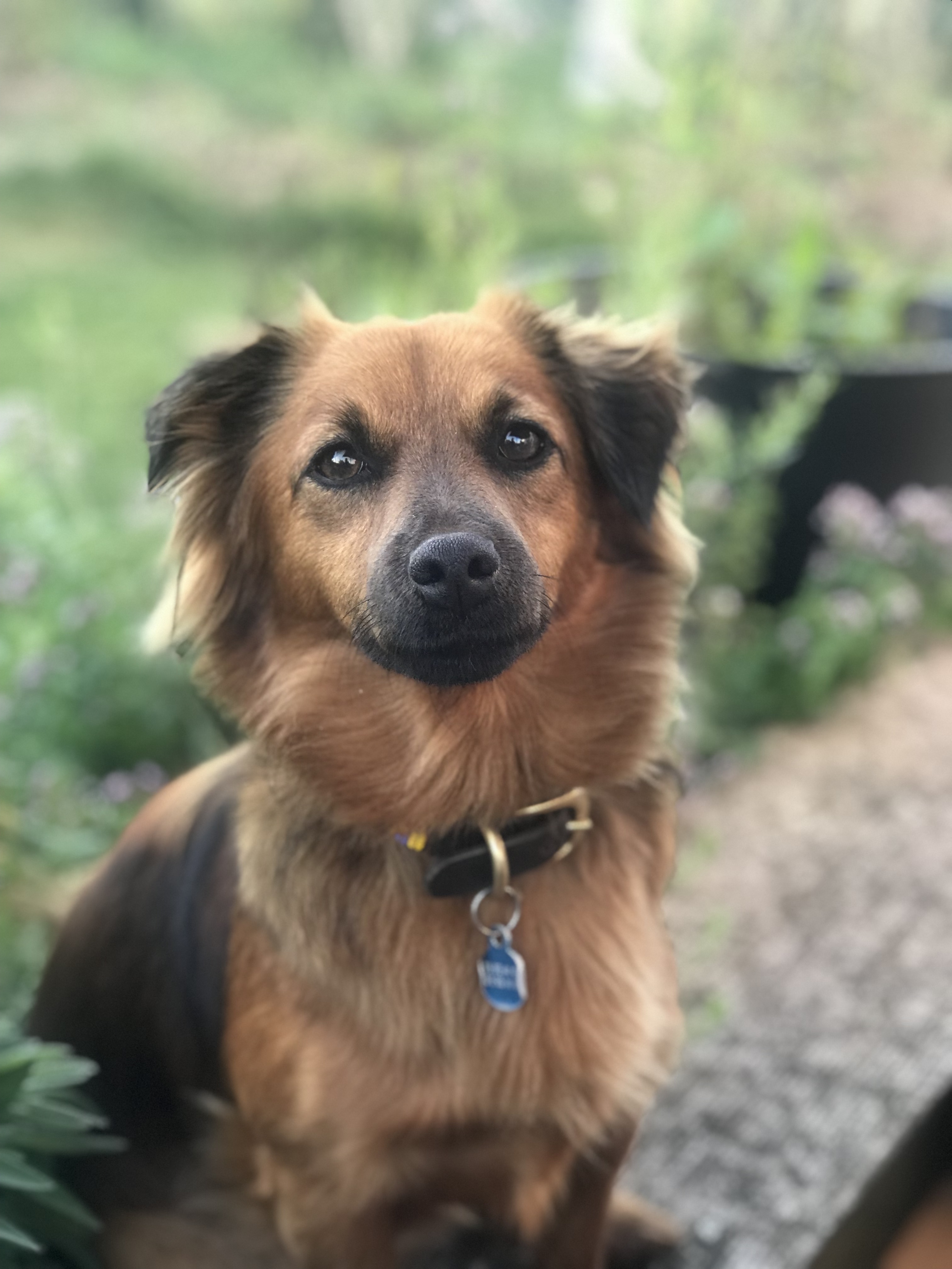 Painting of a brown and black dog wearing a collar with a tag.