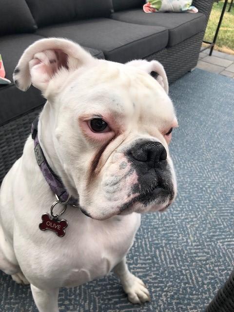 Painting of a white bulldog named Olive wearing a collar.