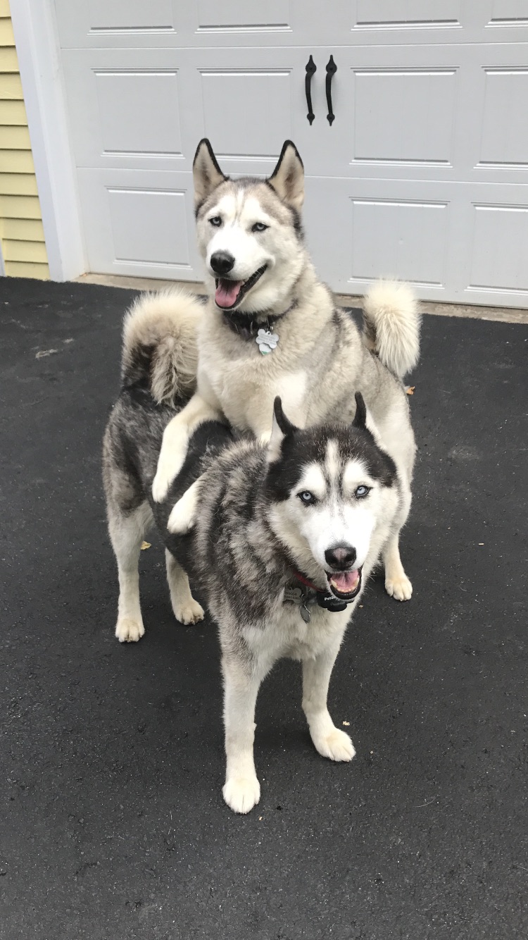Painting of two huskies, one sitting on top of the other.