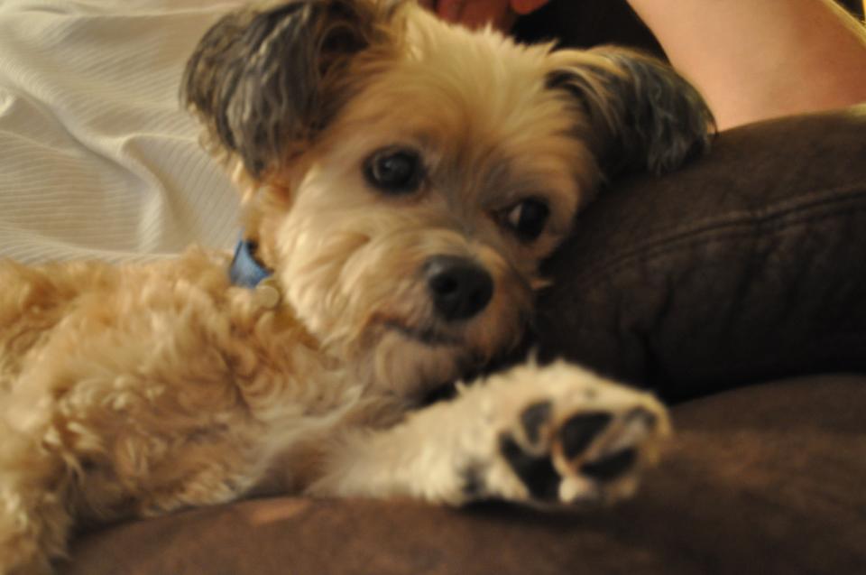 Painting of a small, light brown dog with dark eyes and paws.
