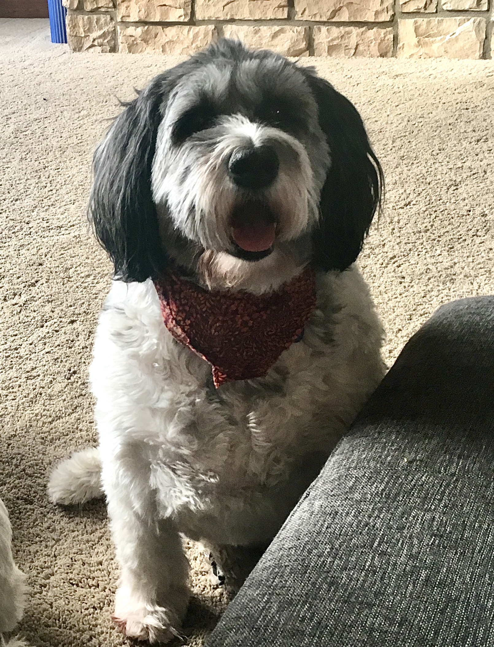 Painting of a fluffy black and white dog wearing a red bandana