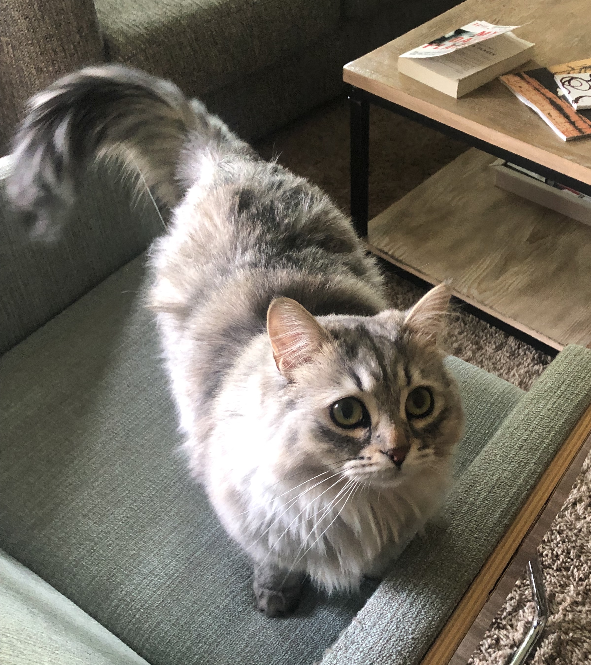 Painting of a grey and white longhaired cat