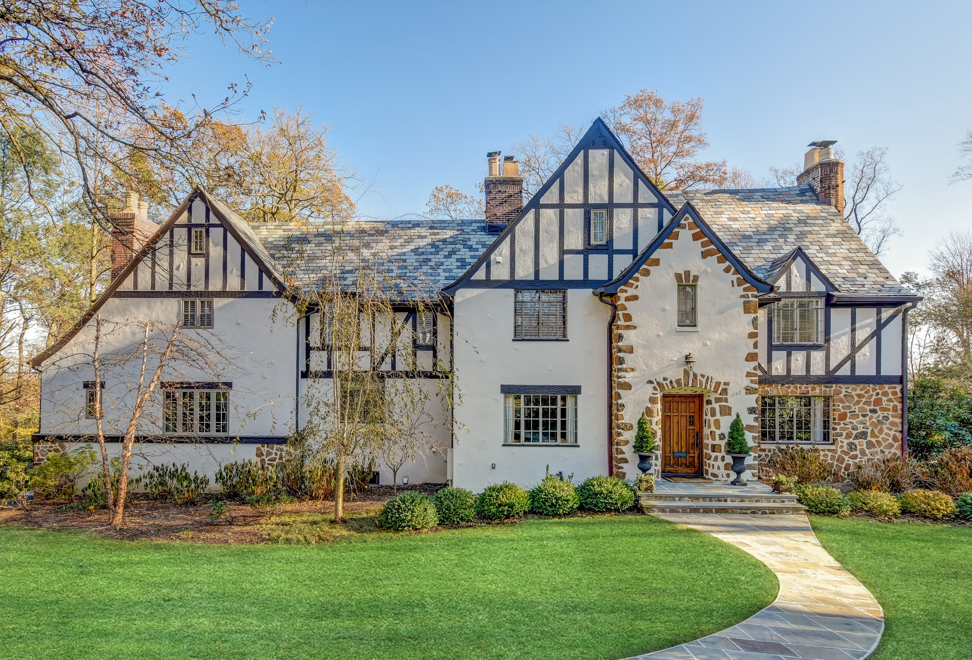 Painting of a large Tudor-style house on a lawn with autumn trees.