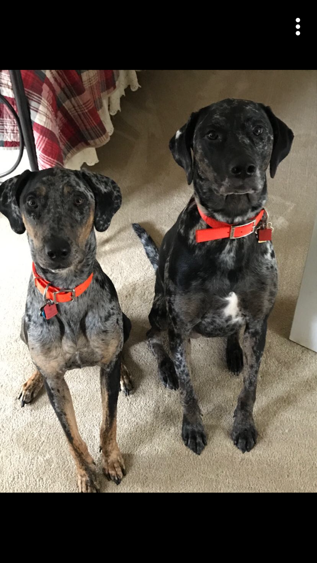 Painting of two dark-colored dogs sitting in grass in front of a barn.