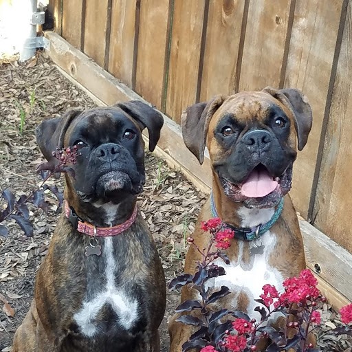 Painting of two boxer dogs sitting together, one with a serious expression, the other smiling, next to red flowers.