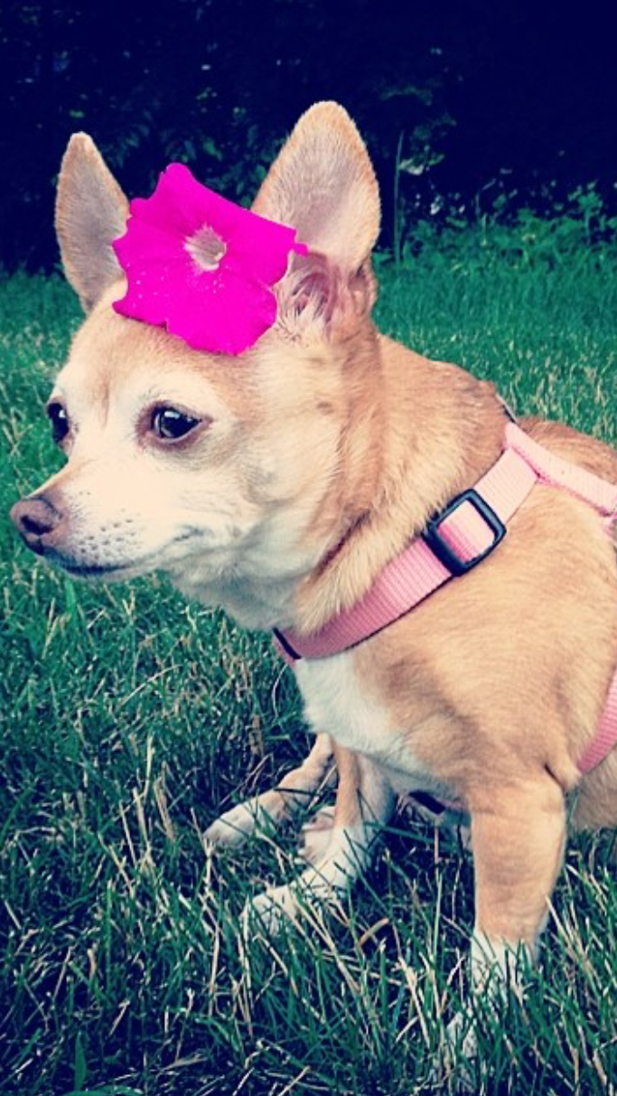 Painting of a tan chihuahua wearing a pink collar and a pink flower on its head.