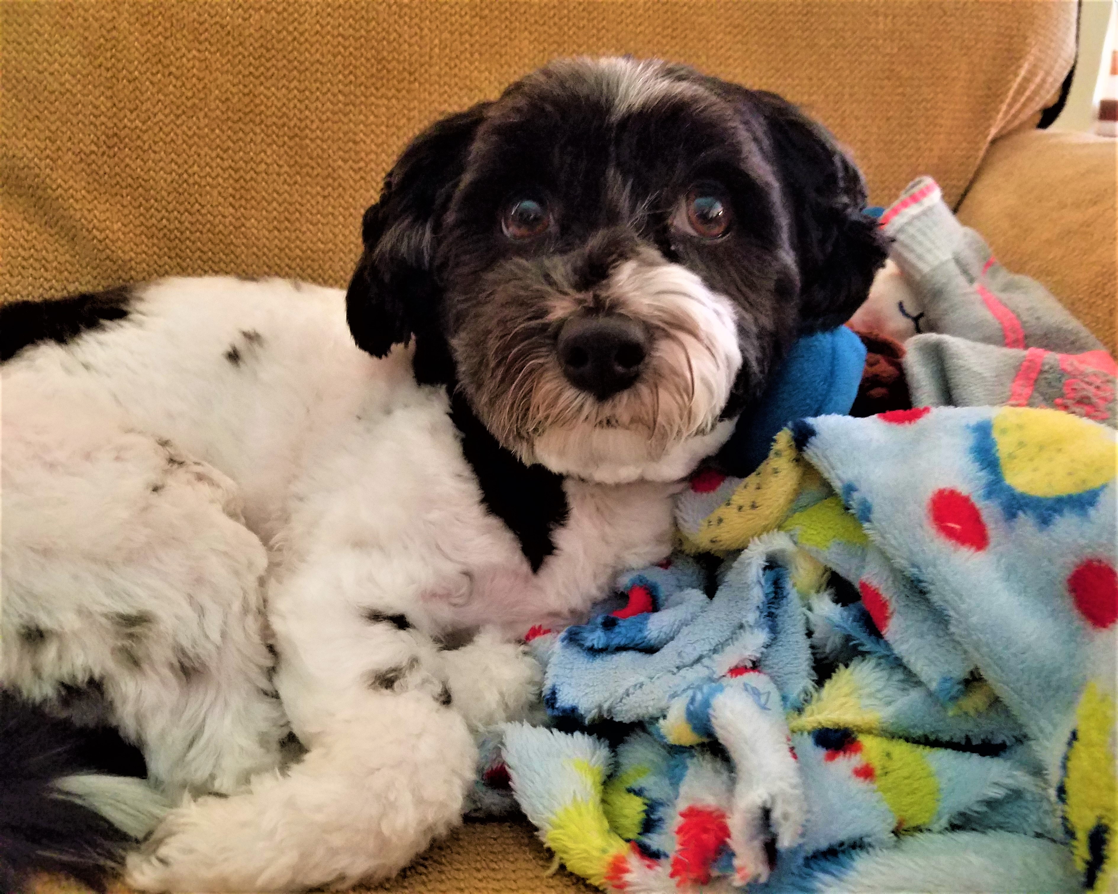 Painting of a small black and white dog wearing a blue collar.