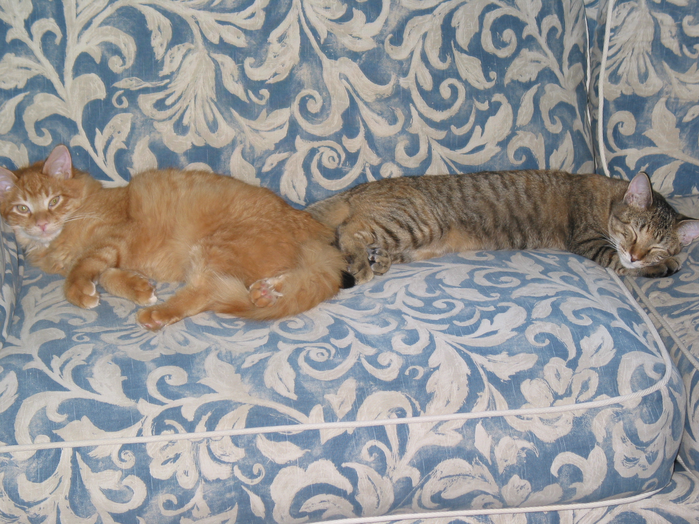 Painting of an orange tabby cat embracing a grey tabby cat.