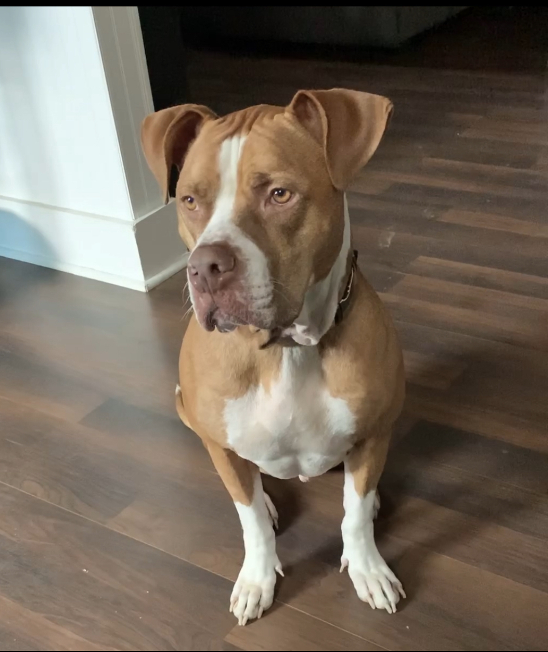 Painting of a tan and white pit bull wearing a collar
