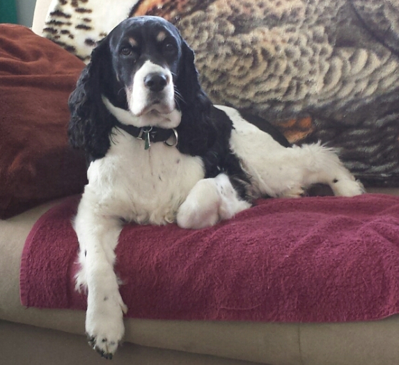 Painting of a black and white Springer Spaniel lying on a red cushion.