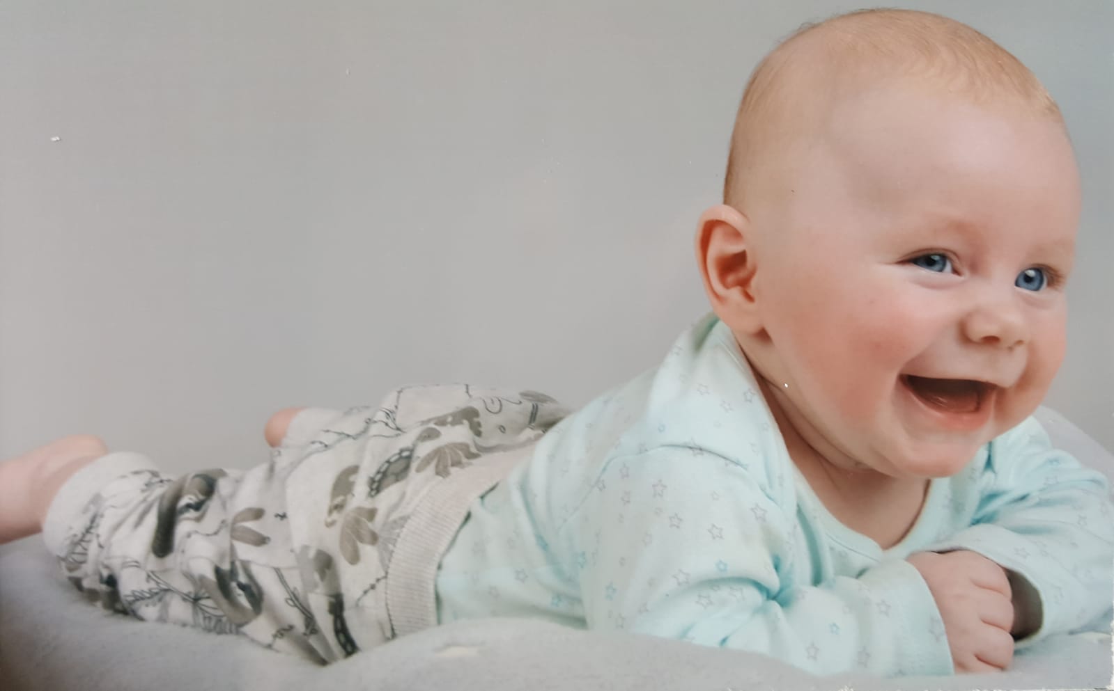 Painting of a laughing baby lying on its stomach