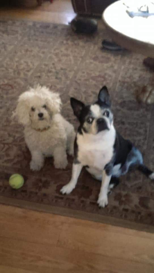 Painting of a white poodle and a Boston Terrier sitting on a wood floor, with a tennis ball.