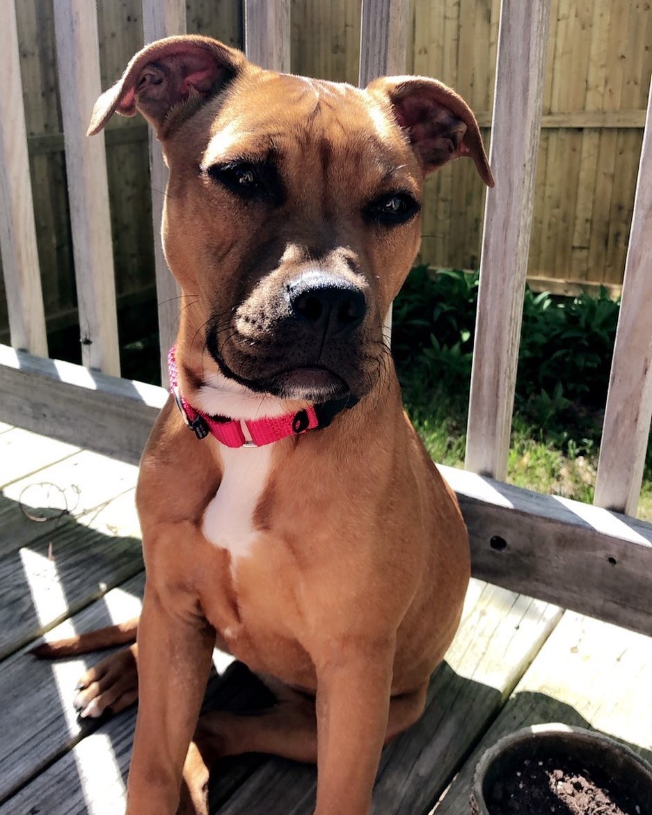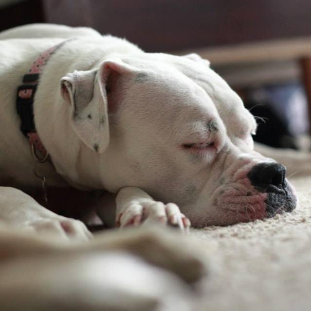 Painting of a sleeping white American Bulldog wearing a pink collar.