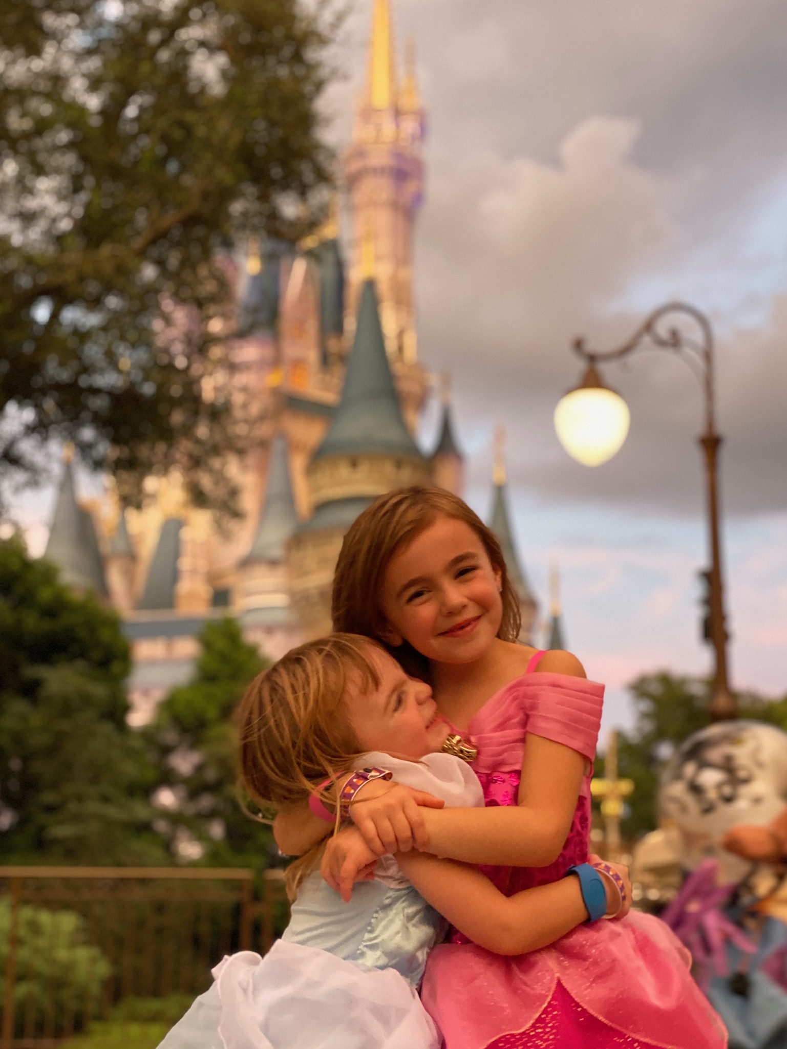 Painting of two sisters hugging in front of Cinderella Castle.