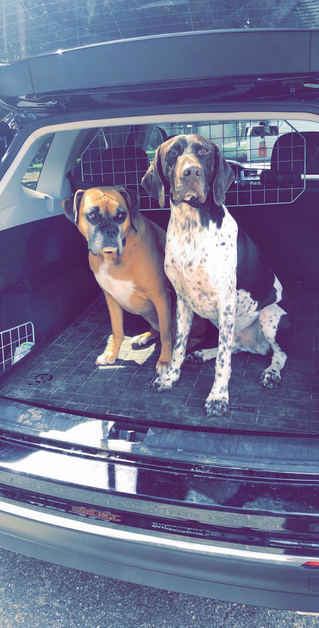 Painting of a Boxer and a Pointer sitting side-by-side.