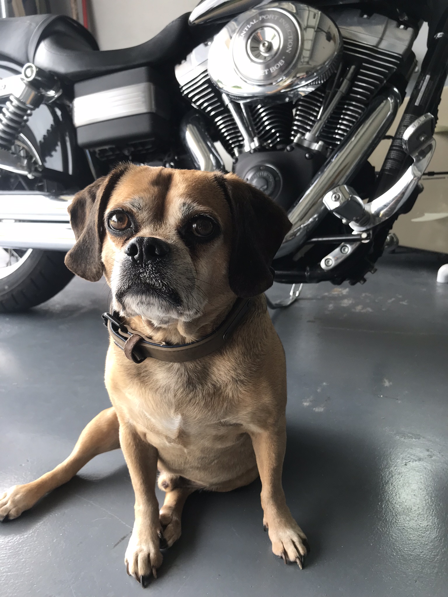 Painting of a small, light brown dog sitting in front of a motorcycle engine.