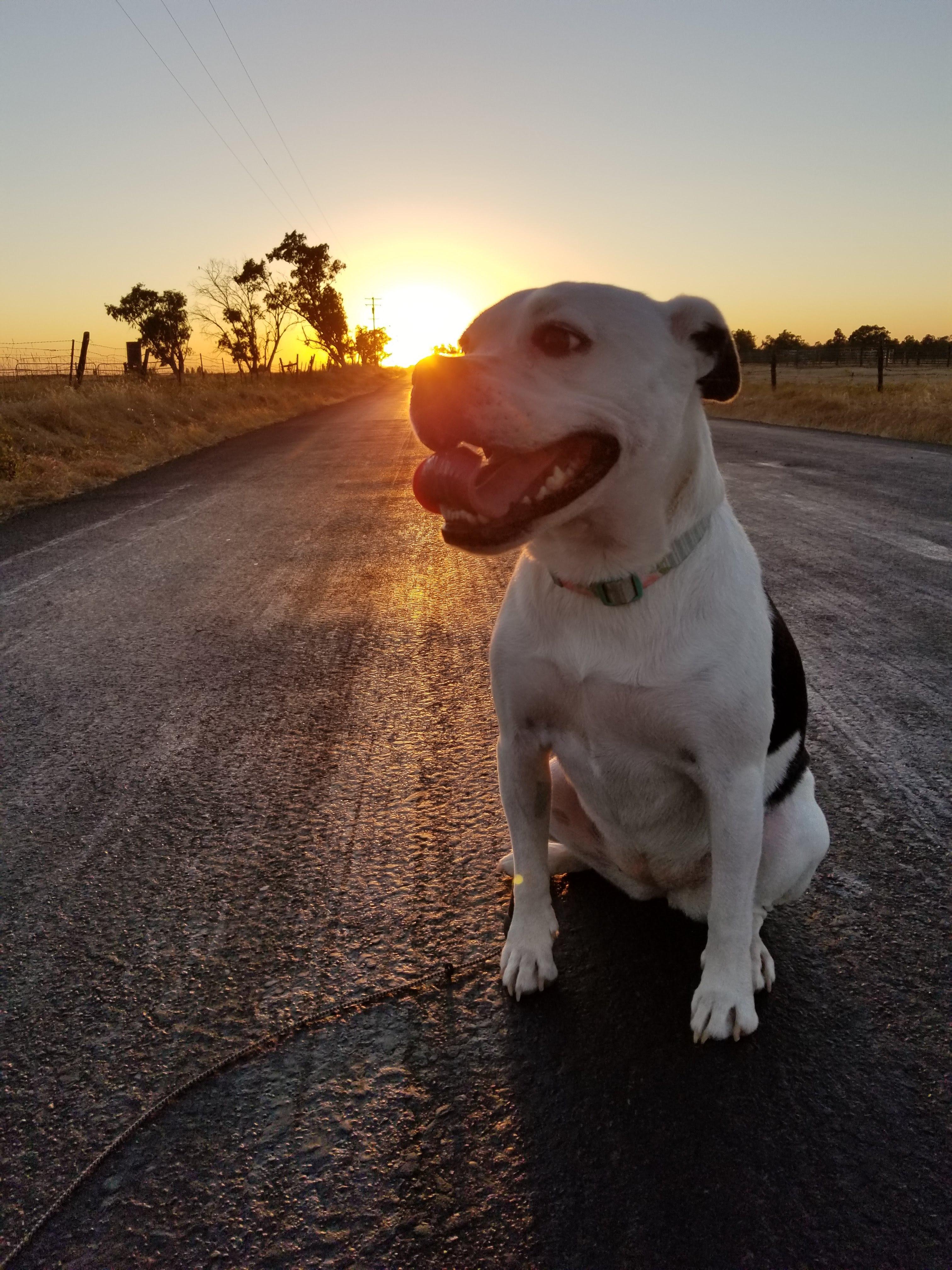Painting of a happy dog sitting on a road at sunset.