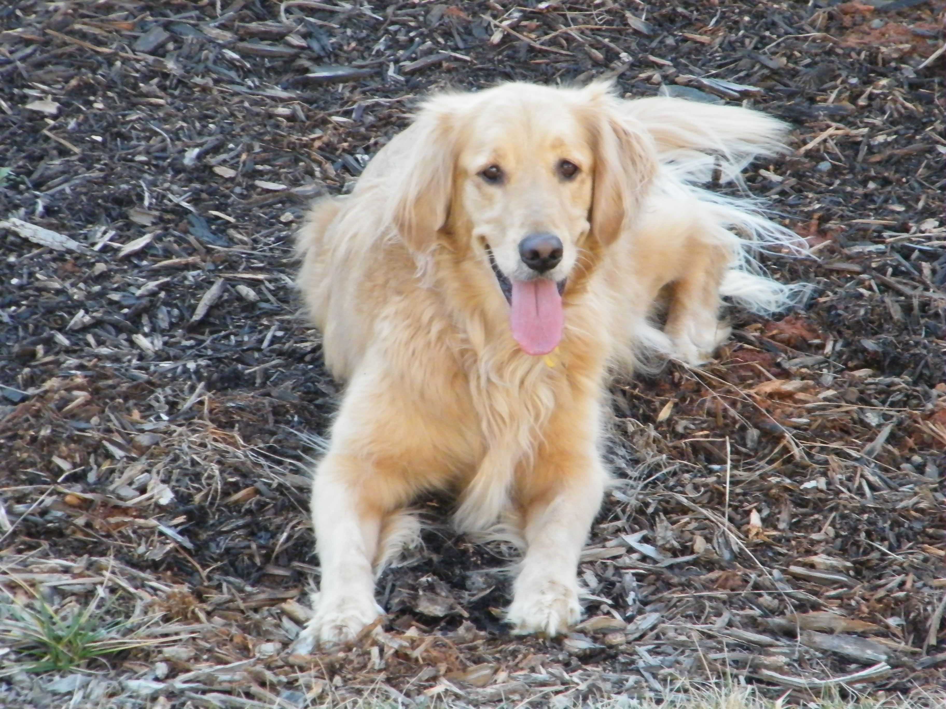 Painting of a Golden Retriever lying on a hardwood floor.