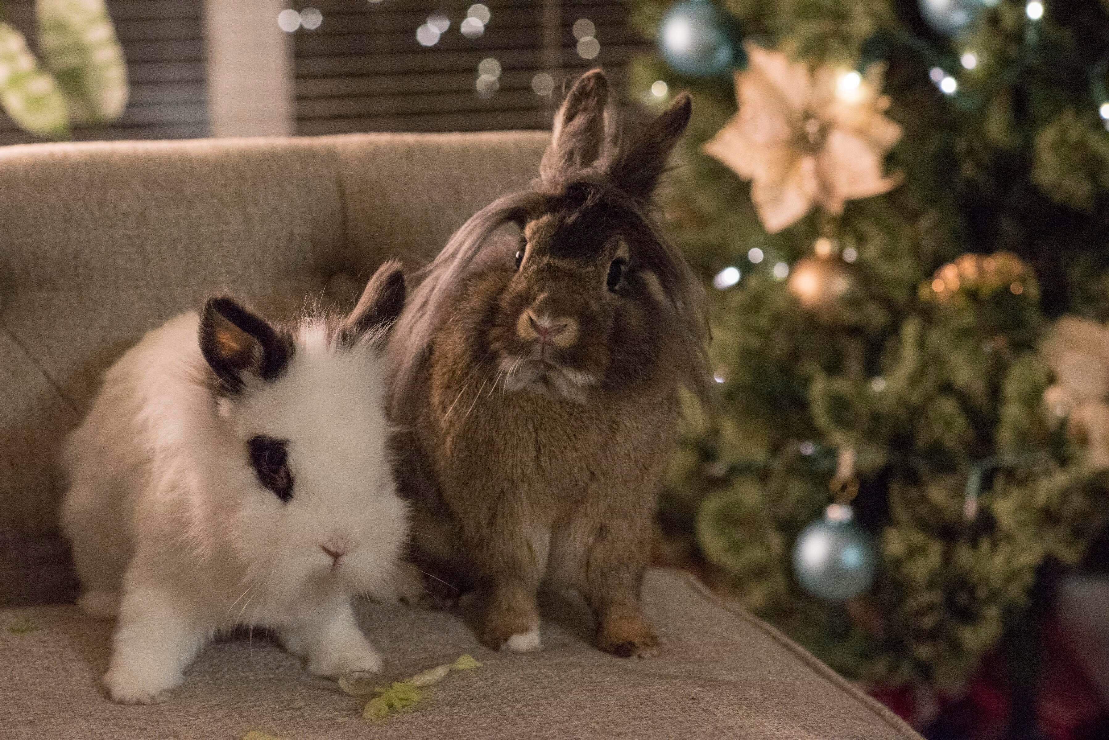 Painting of two rabbits near a Christmas tree.