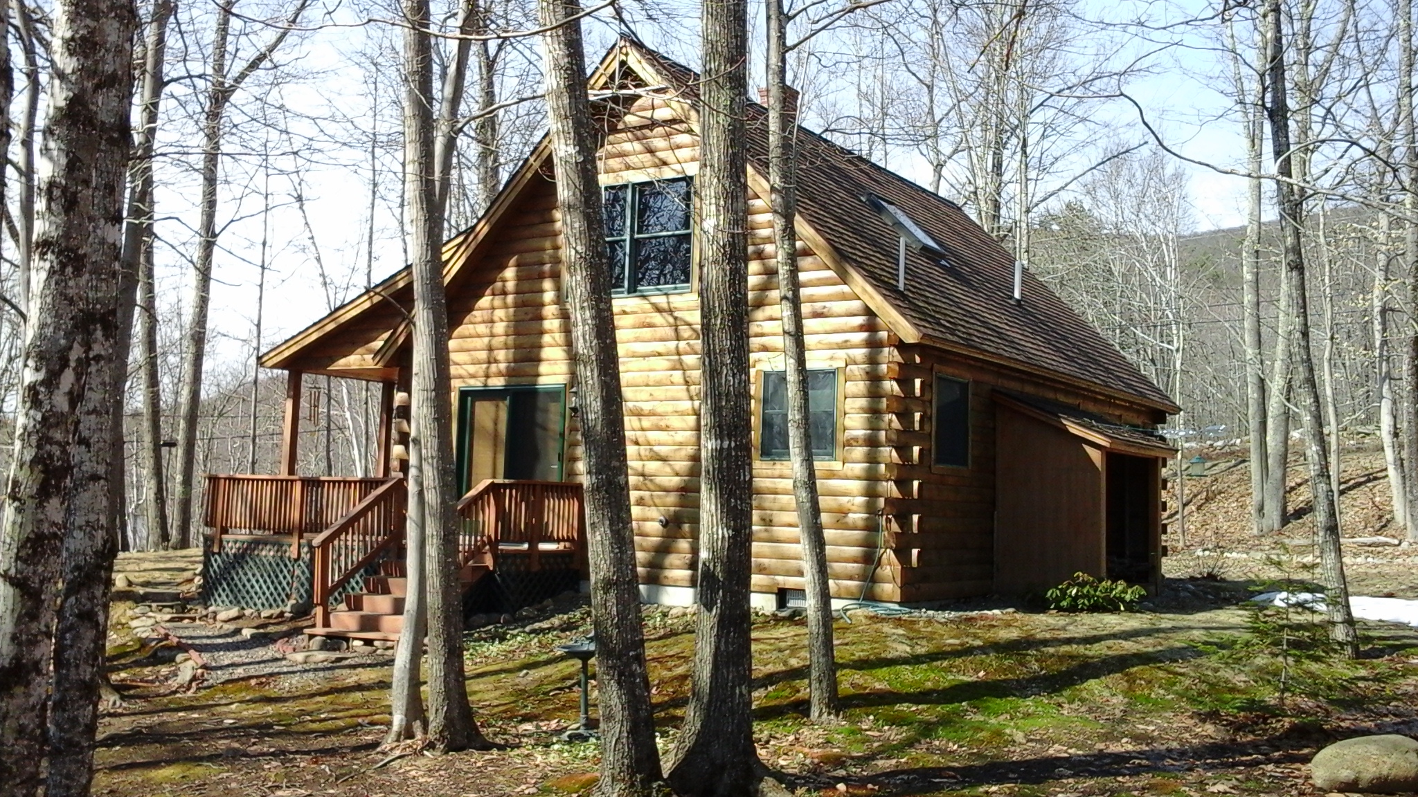 Painting of a log cabin in a wooded area.