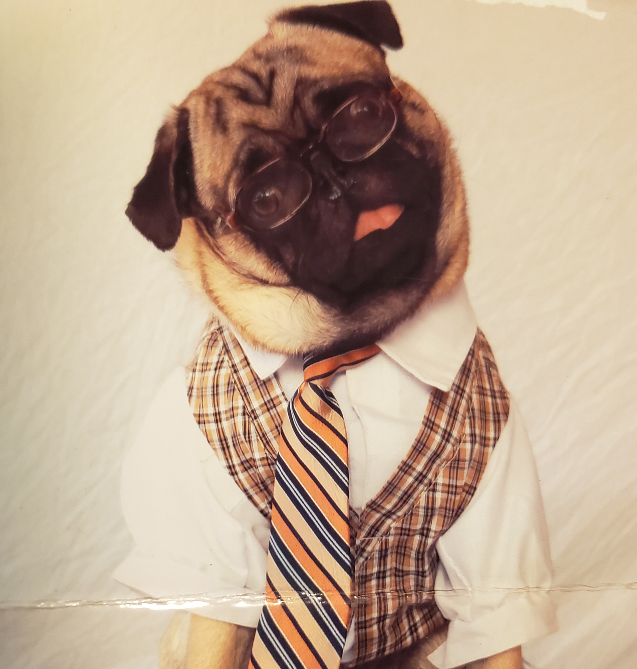 Painting of a pug wearing glasses, a vest, and a tie.