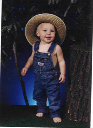 Painting of three toddlers in overalls and straw hats in a pumpkin patch.