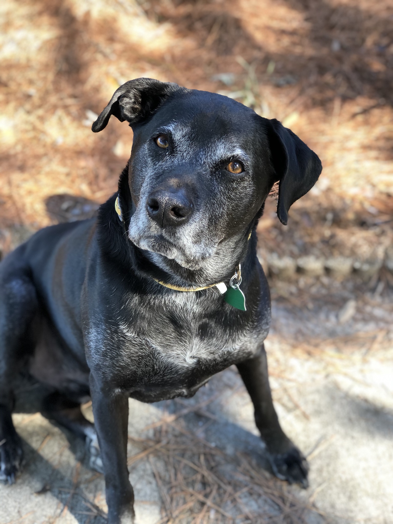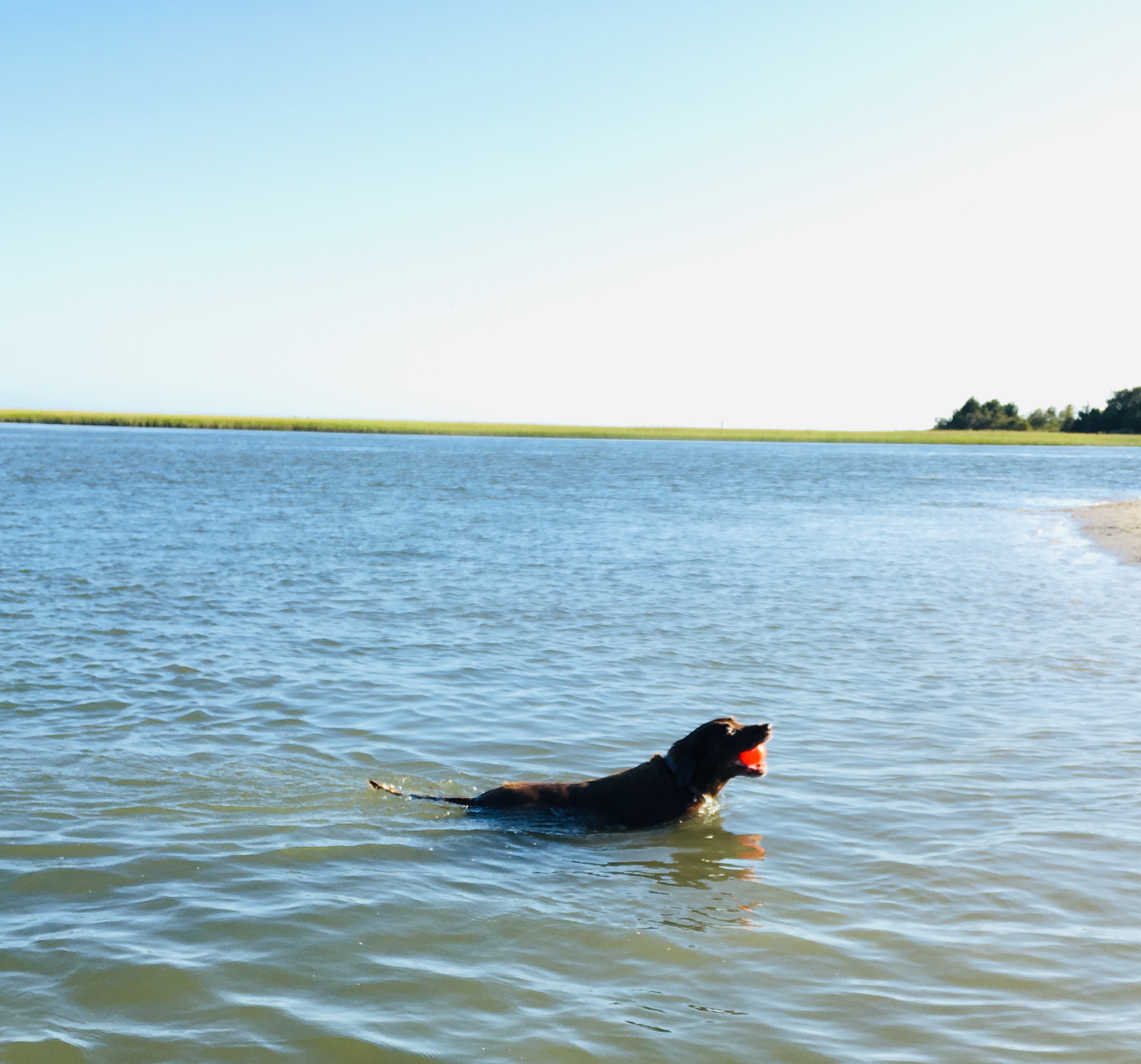 Painting of a brown Labrador Retriever at the beach at sunset.