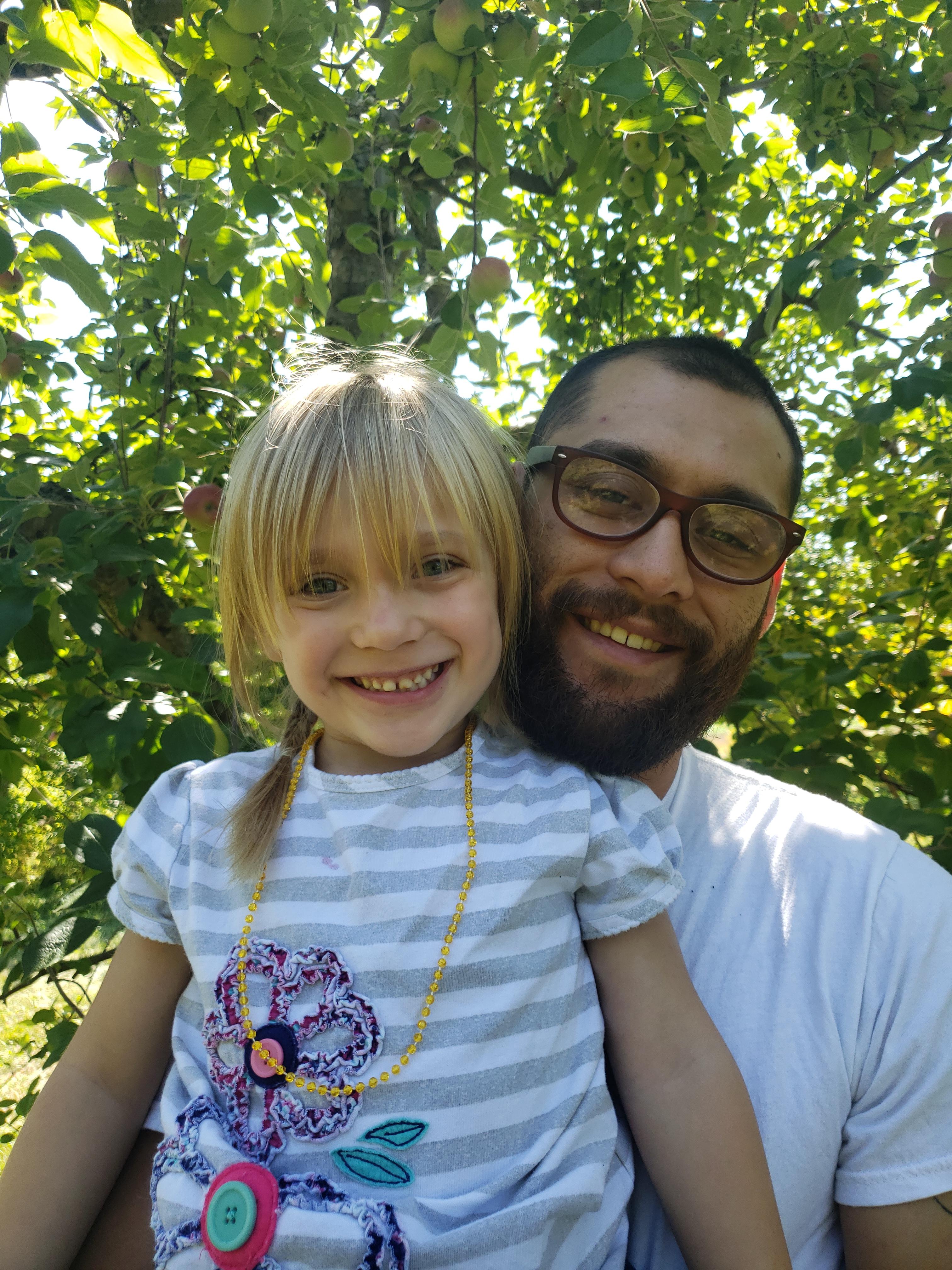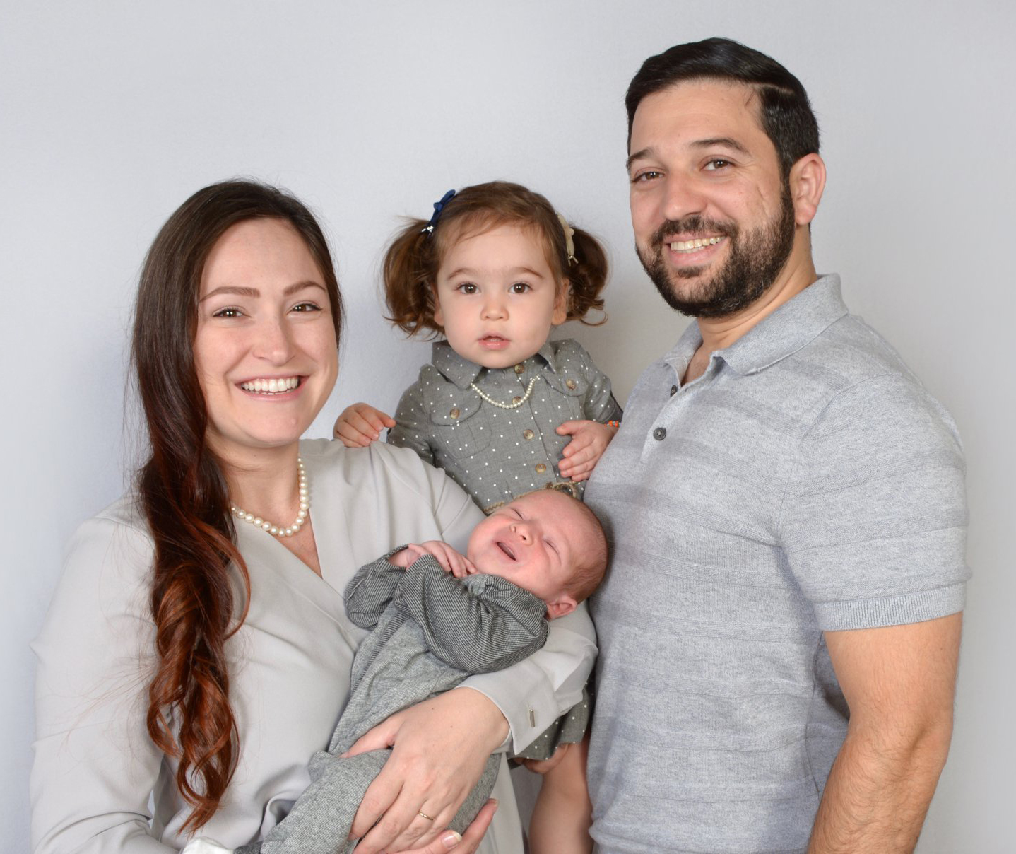 Oil painting of a grandmother, granddaughter, and father smiling together.