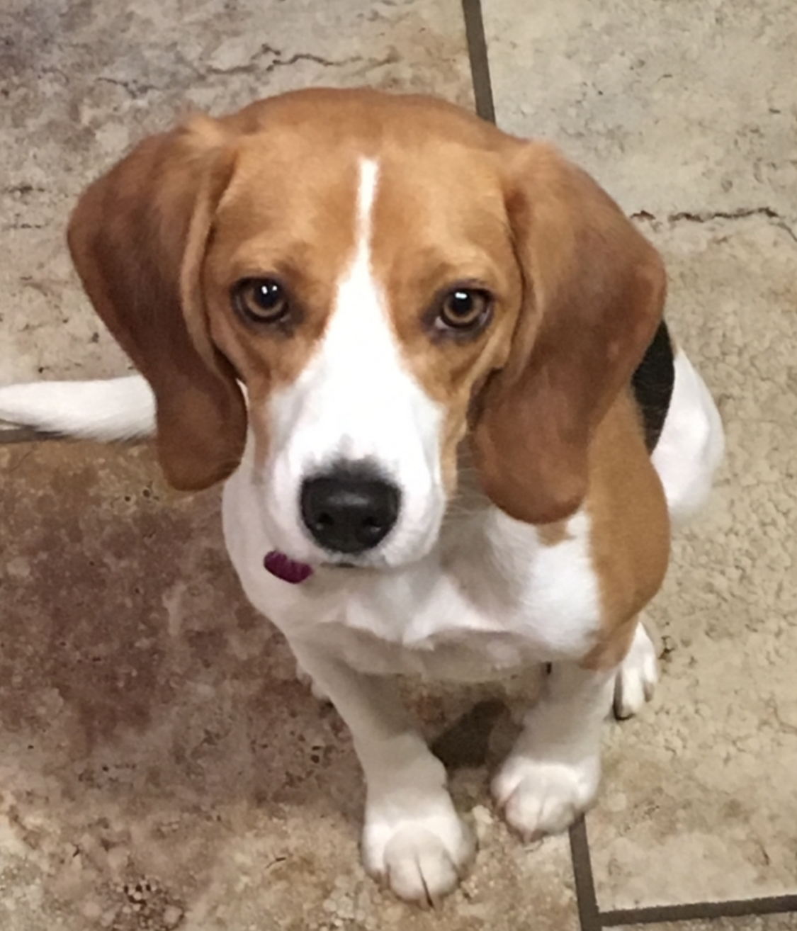 Painting of a beagle resting on a leopard print cushion.
