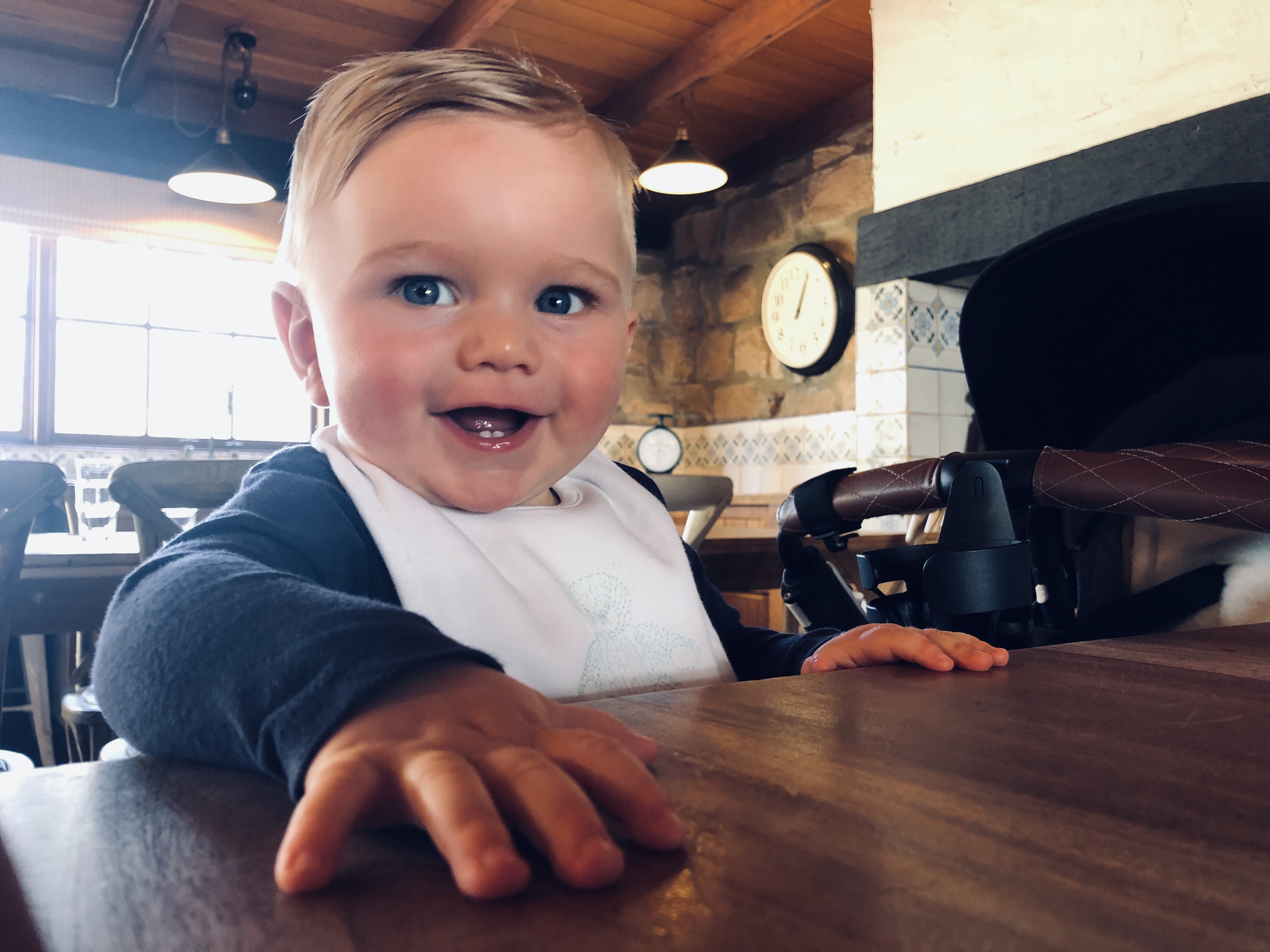 Painting of a smiling baby in a blue sweater and bib sitting at a wooden table