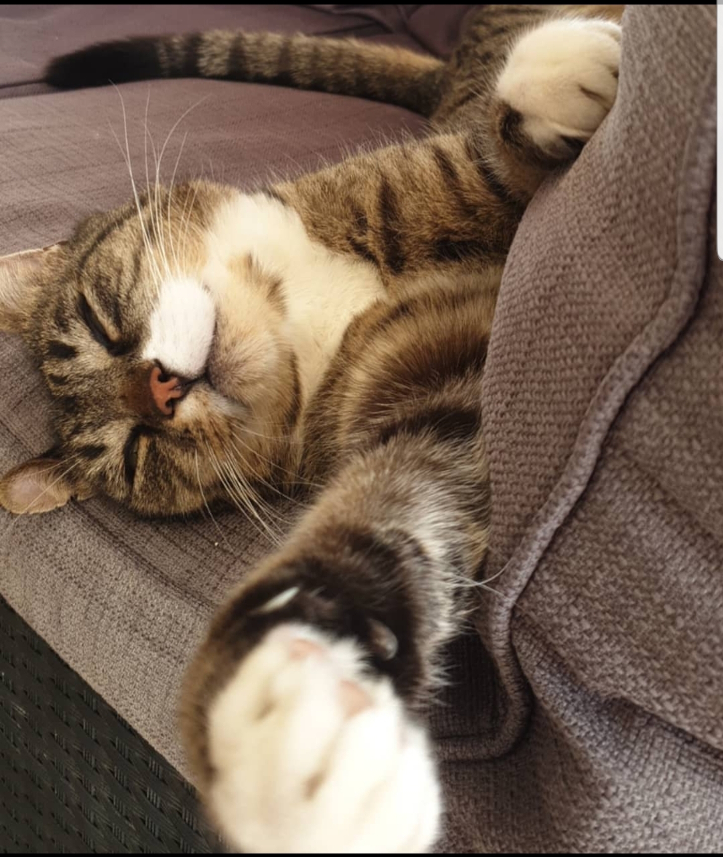 Painting of a tabby cat sleeping on a brown fabric surface.