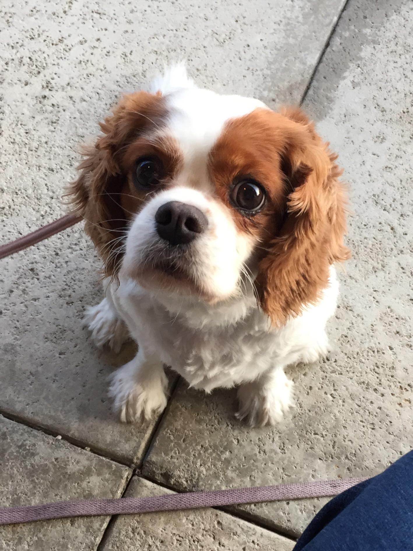 Painting of a Cavalier King Charles Spaniel looking up.