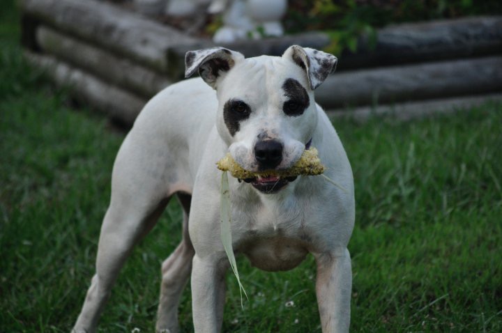 Painting of a white dog with dark patches around its eyes wearing a purple collar