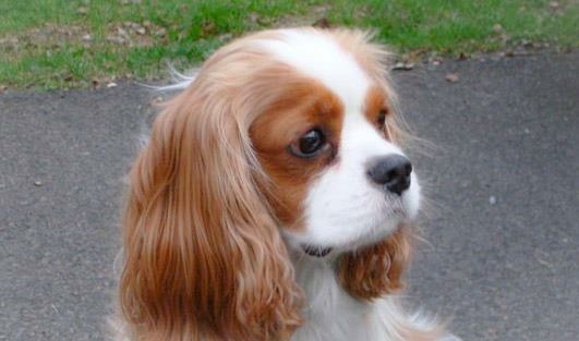 Painting of a Cavalier King Charles Spaniel head and shoulders.