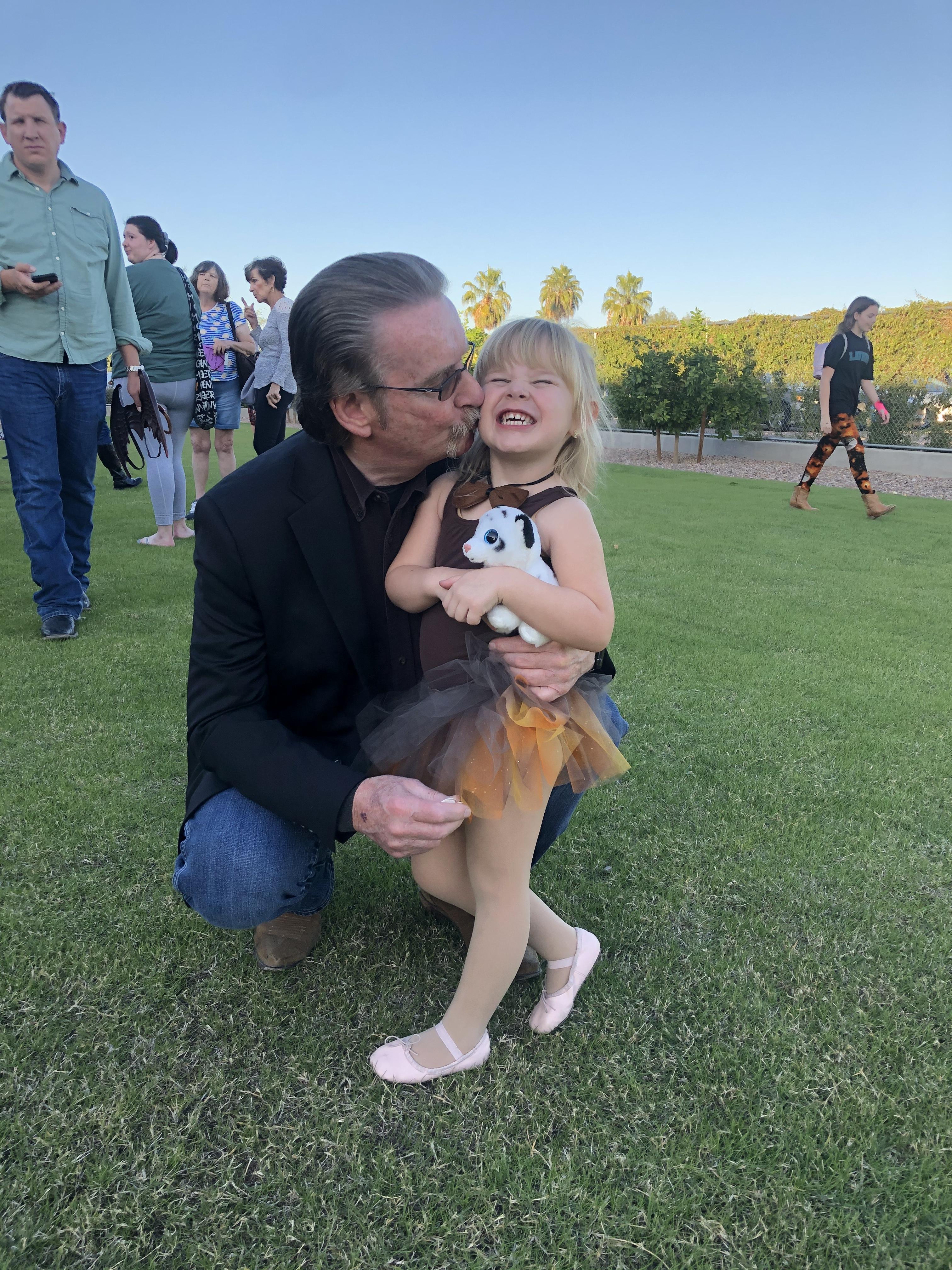 Painting of a grandfather kissing his granddaughter on the cheek, she`s holding a stuffed animal.