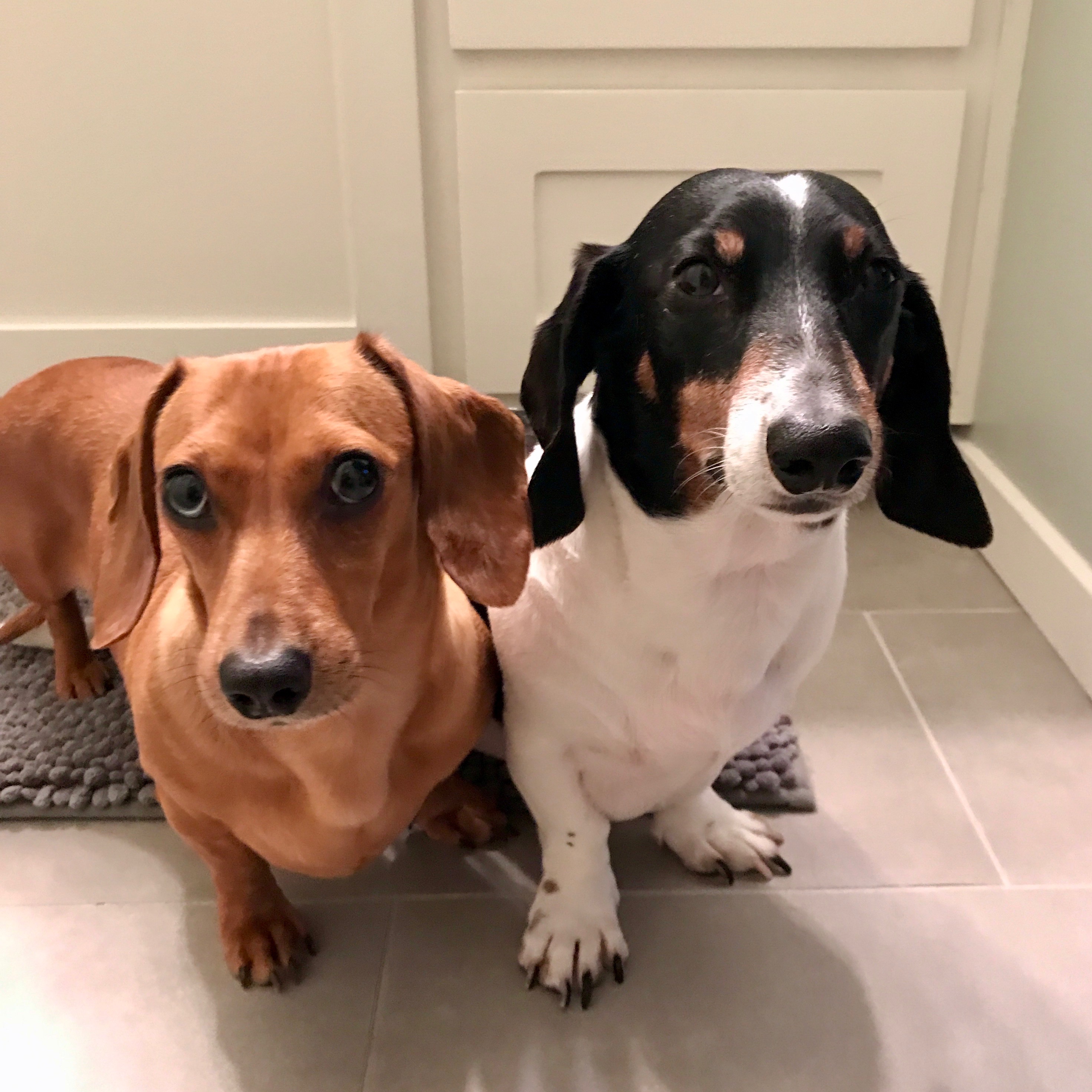 Painting of two dachshunds sitting and looking up at the viewer. One is reddish-brown, the other black and white.