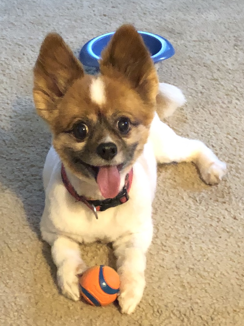 Painting of a happy small dog with an orange ball.